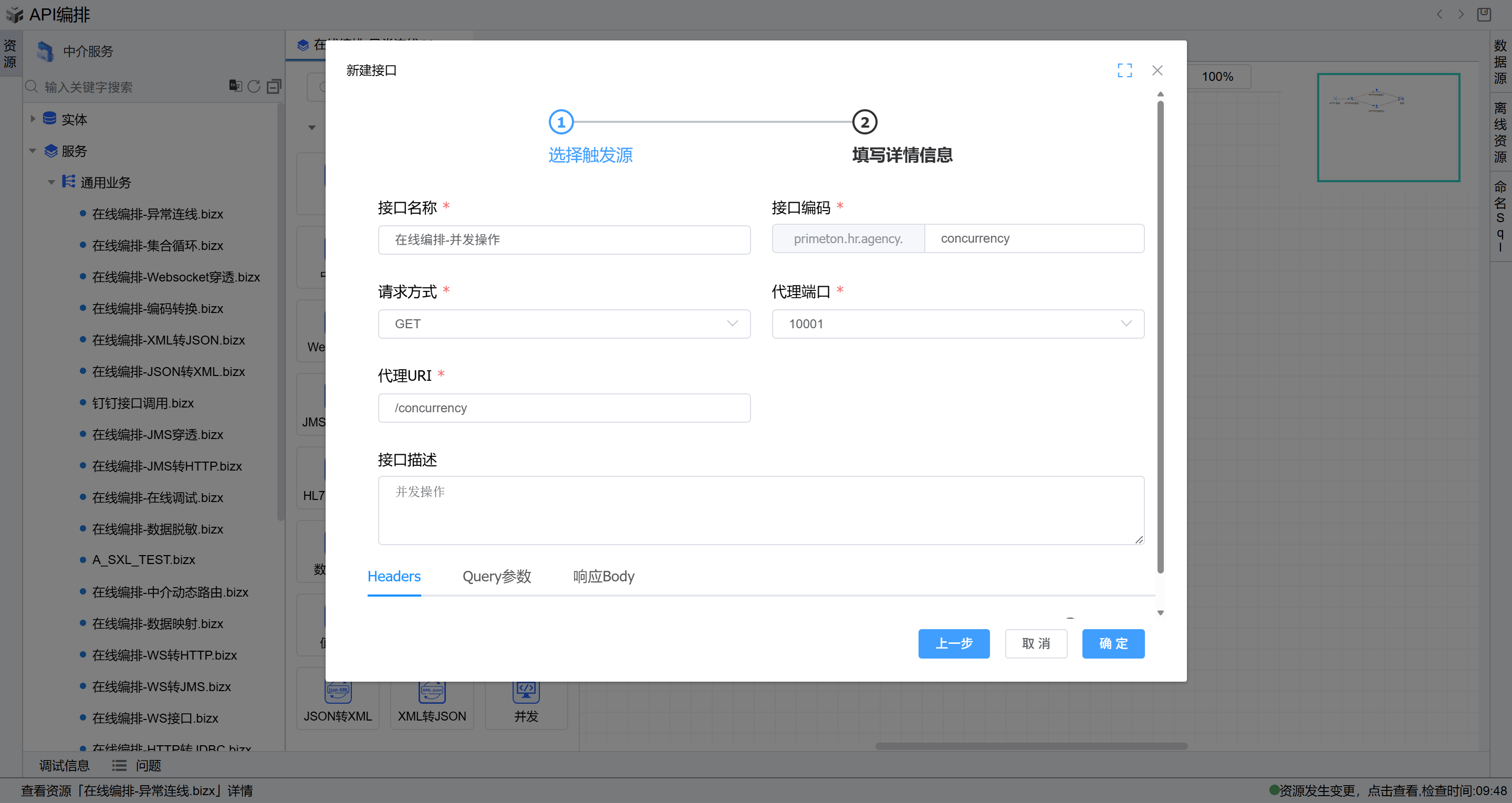 1. 在线编排页面中,在通用业务目录上点击右键,点击新建,点击新建HTTP接口,然后如下图所示填写数据,其中代理URI填写符合规则的接口地址,并点击确定保存。