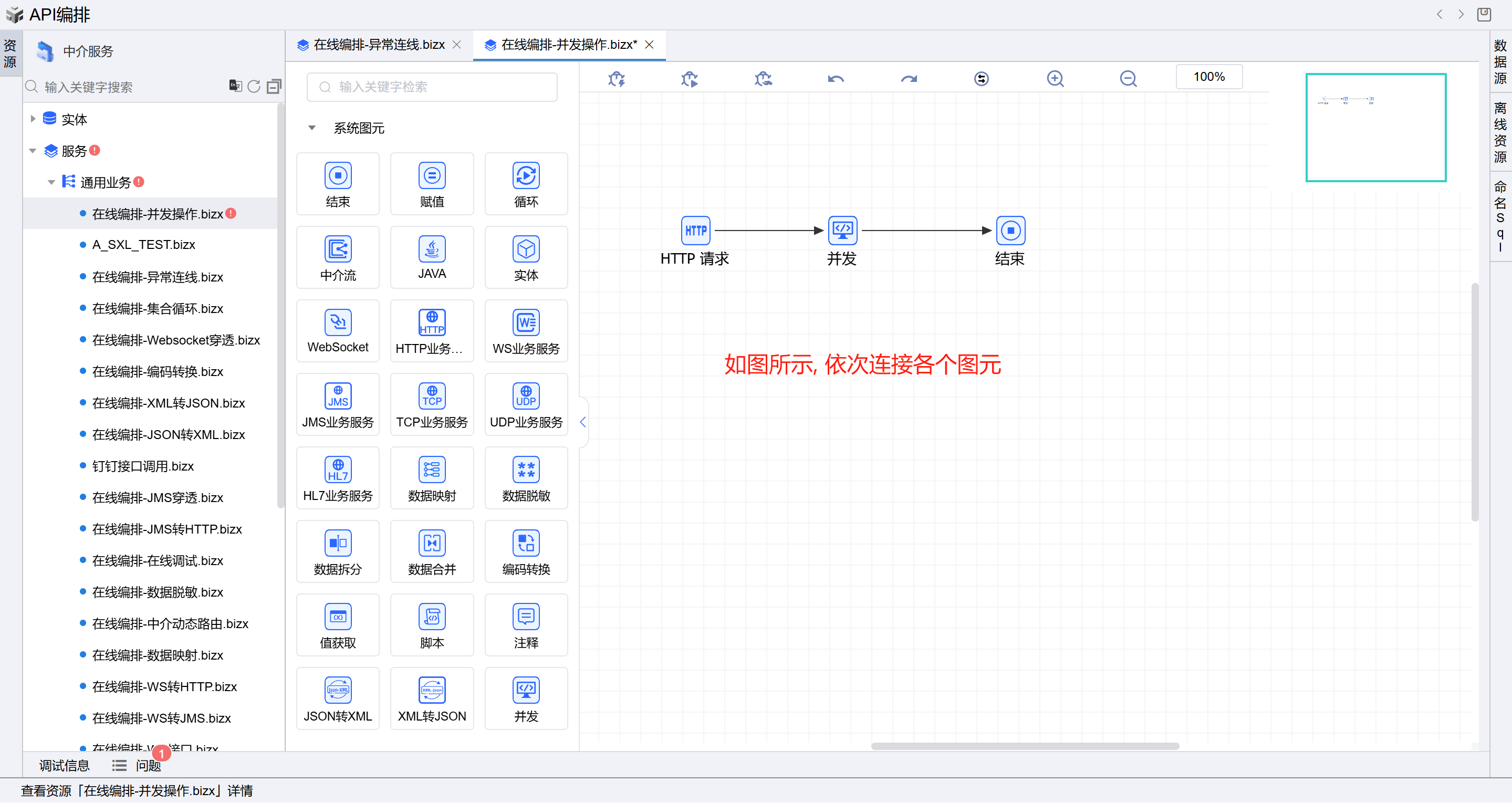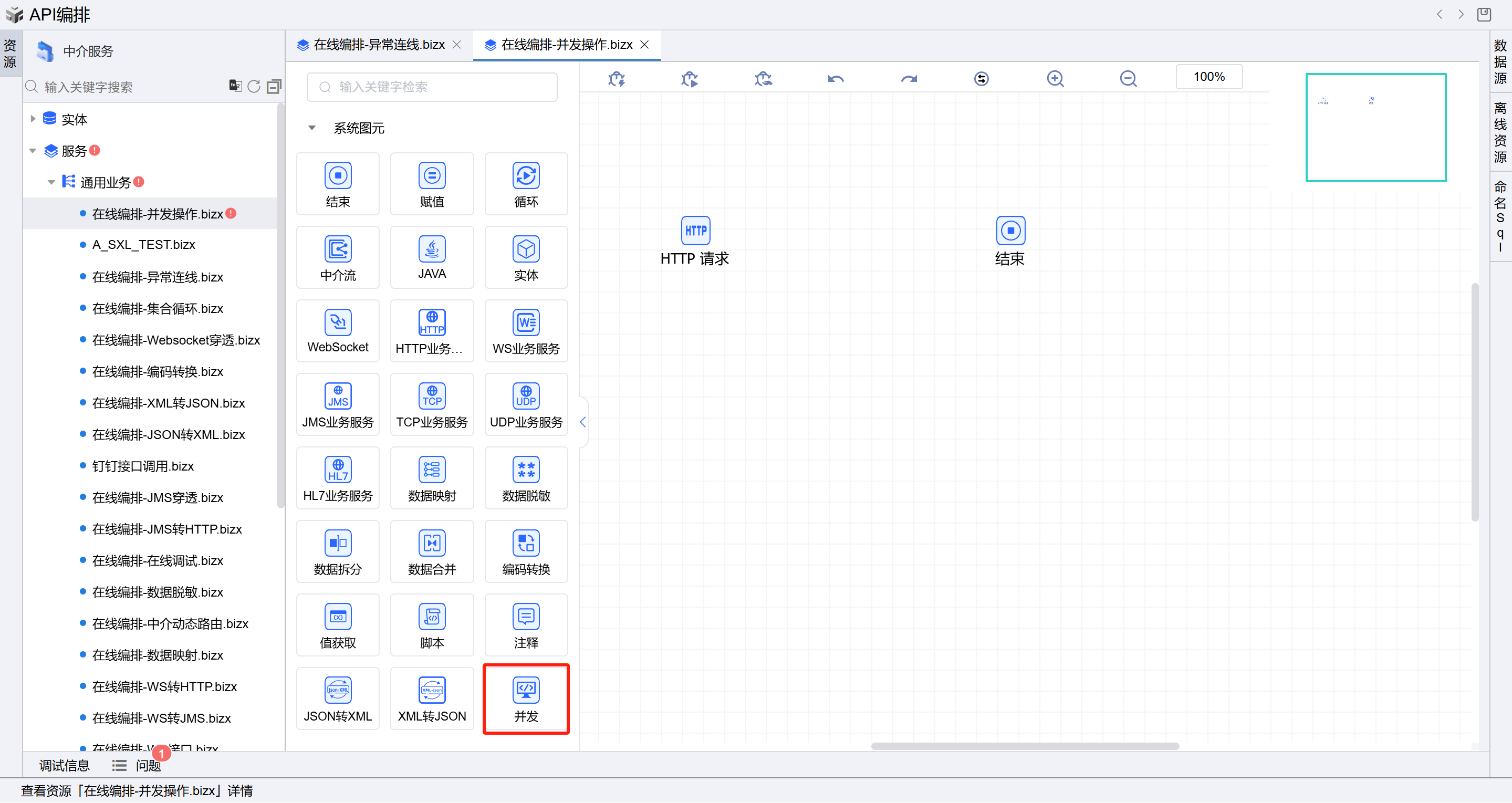 1. 保存成功后系统自动打开中介编排页面,如下图所示。从左侧拖一个并发图元到开始和结束图元中间并依次连接各个图元。如下图:
