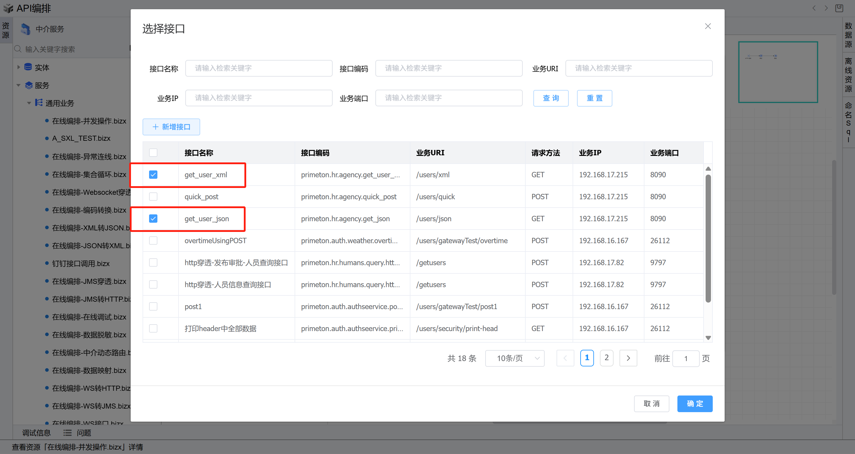 1. 双击并发图元,进入编辑页面,在业务接口右侧点击“选择”按钮,进入选择接口页面,选择前置条件中新增的 get /users/xml 接口 和 get /users/json 接口,点击“确定”按钮回到编辑页面,在表格中的参数和返回值分别选择inMessage和outMessage,点击“确定”按钮保存。如下图: