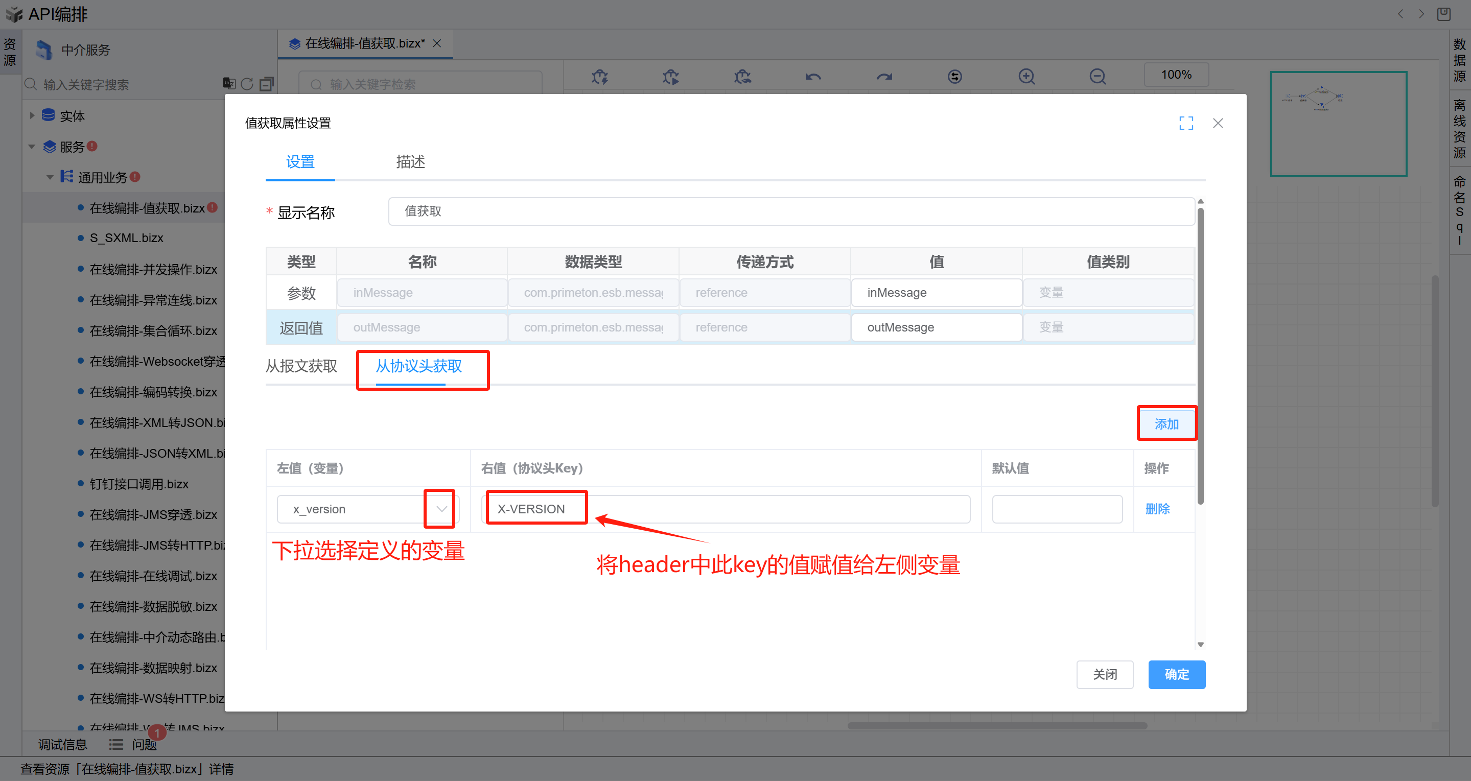 - 双击值获取图元,进入编辑页面,点击“从协议头获取“页签,点击右侧的“添加“按钮,在“左值“列下拉选择上一步定义的变量