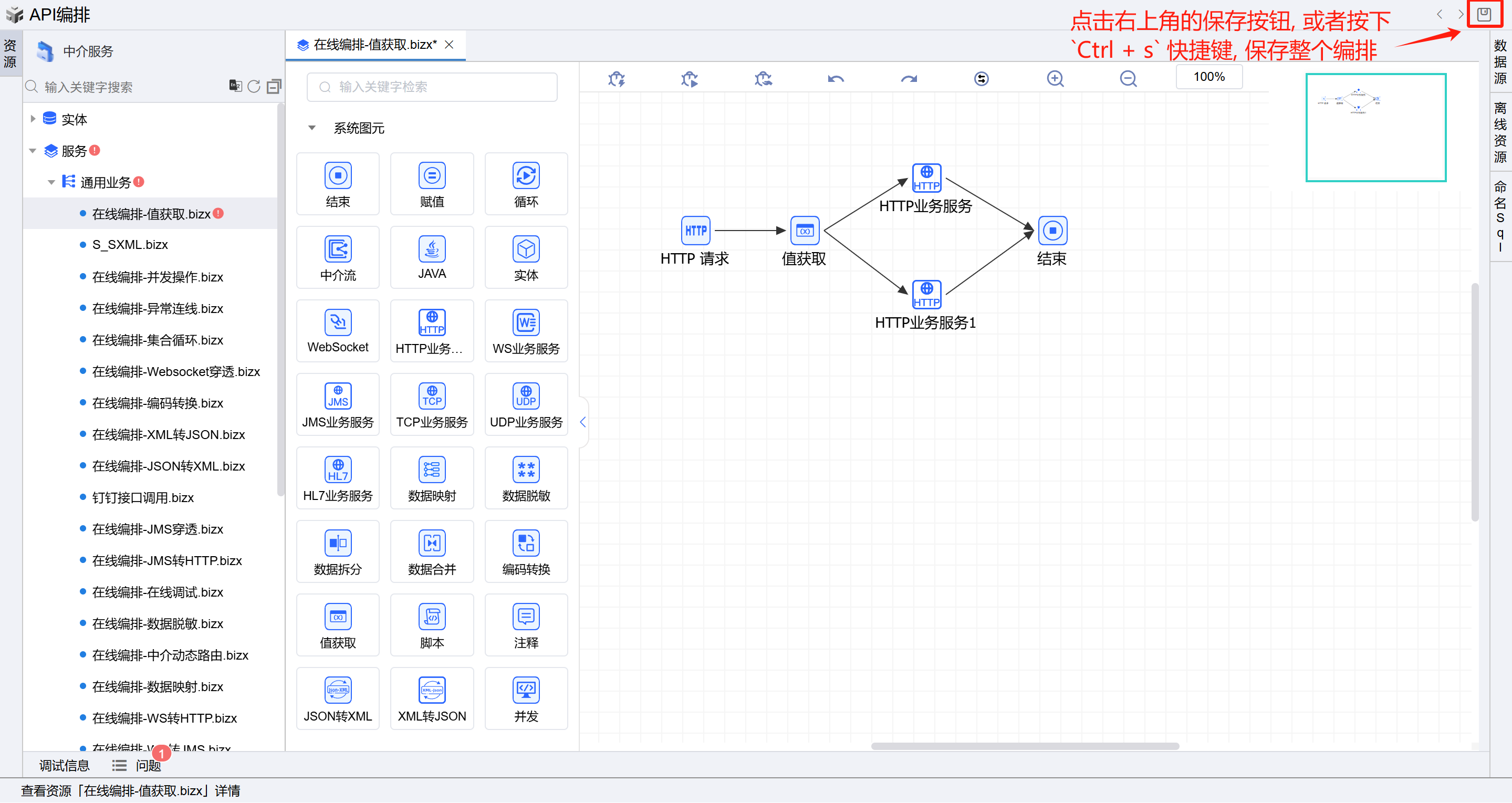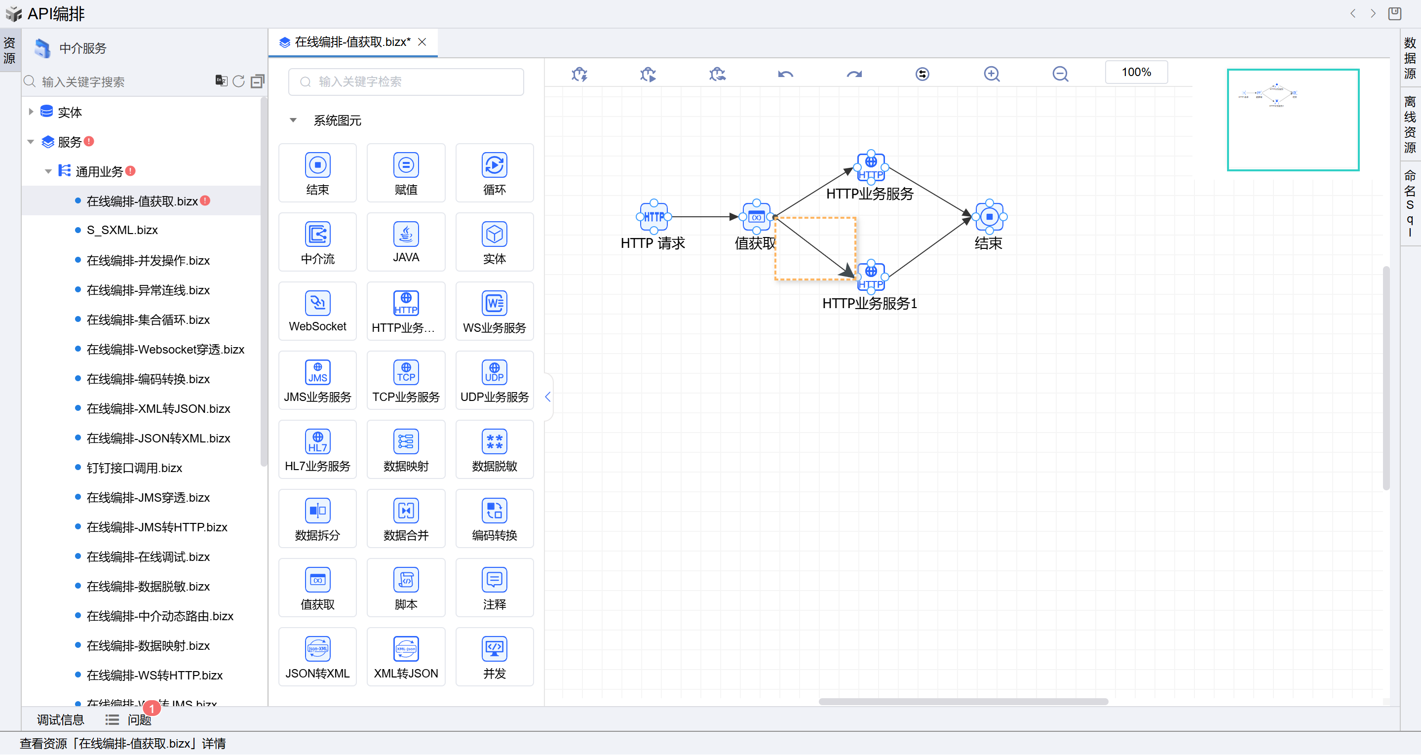 - 1.1. 或者点击中介服务,点击API编排按钮进入在线编排页面。如下图: