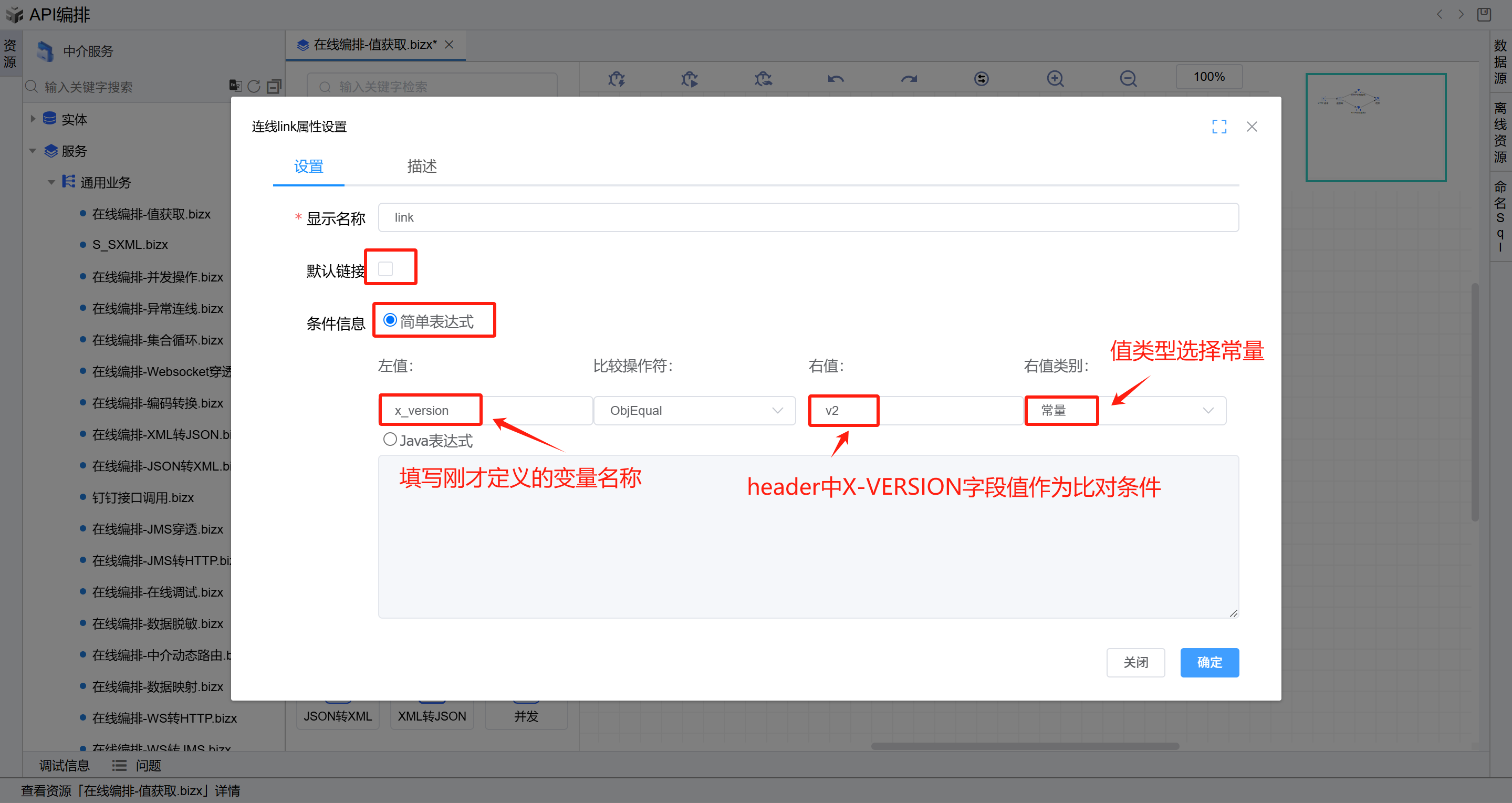 ,点击“确定”按钮保存。这样定义的此连接线功能是根据header中的X-VERSION