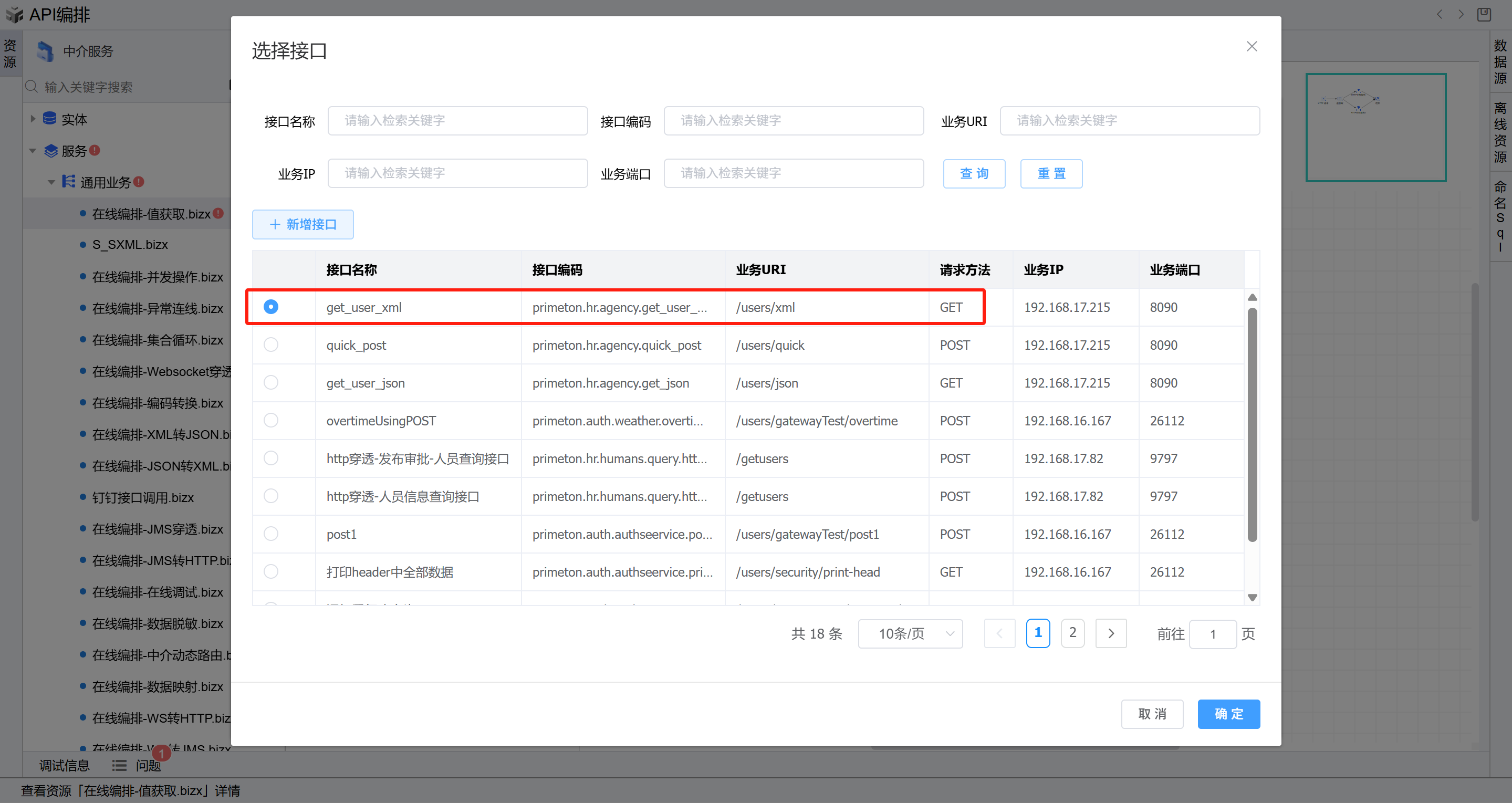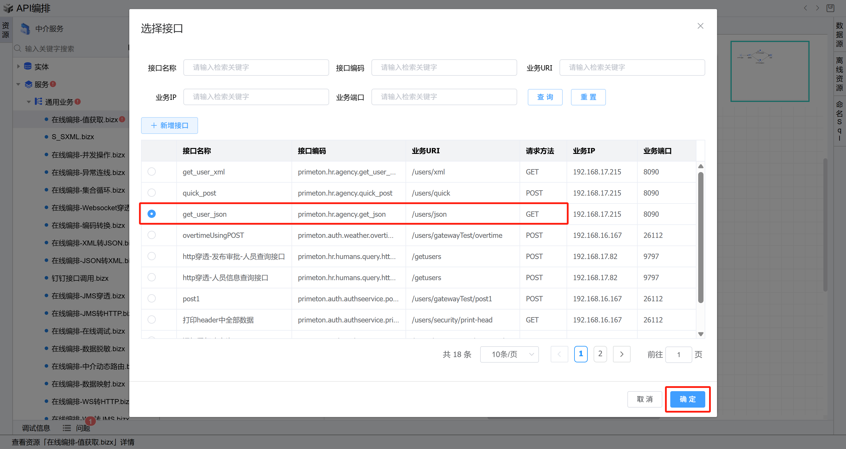 - 双击打开第一个HTTP业务服务图元,在业务接口右侧,点击选择按钮,在弹出的选择接口页面选择前置条件中新增的