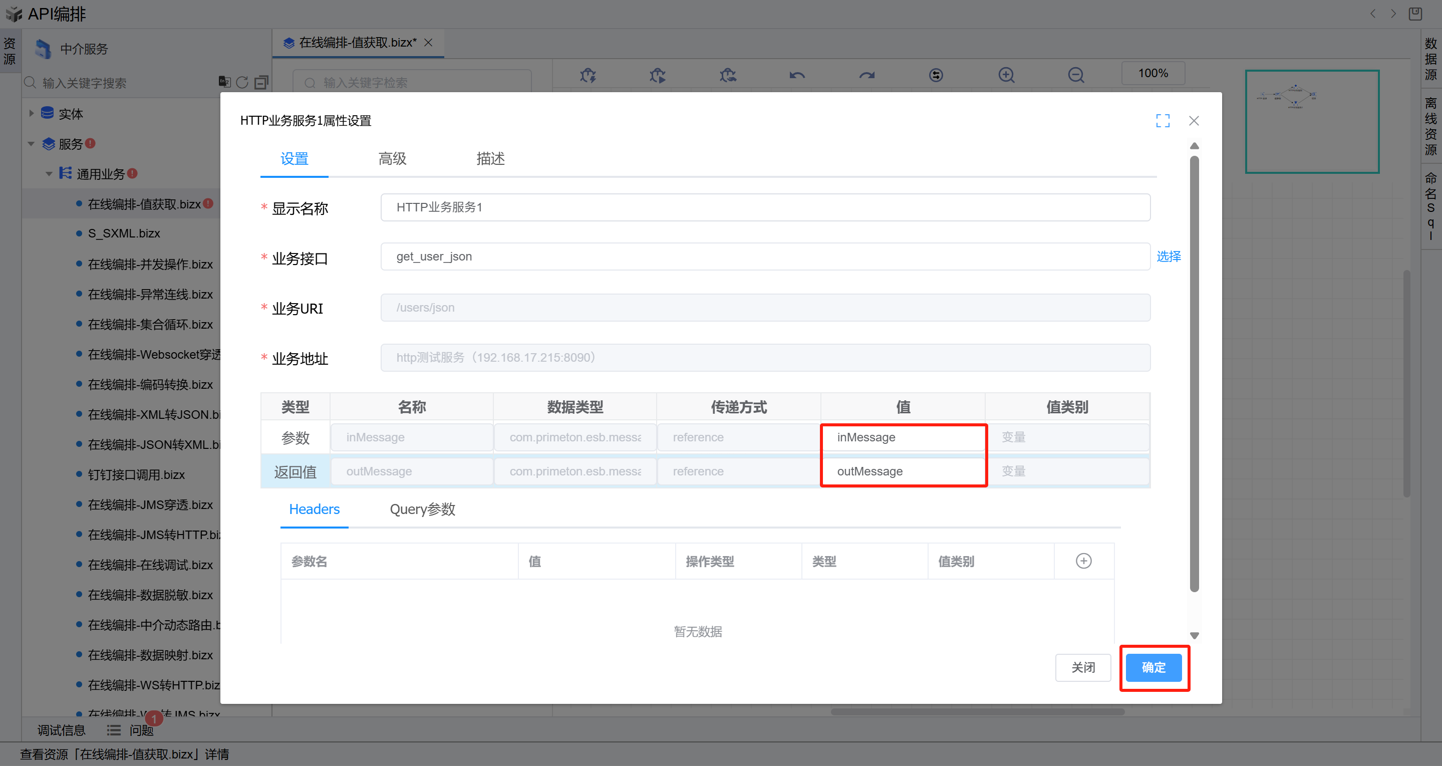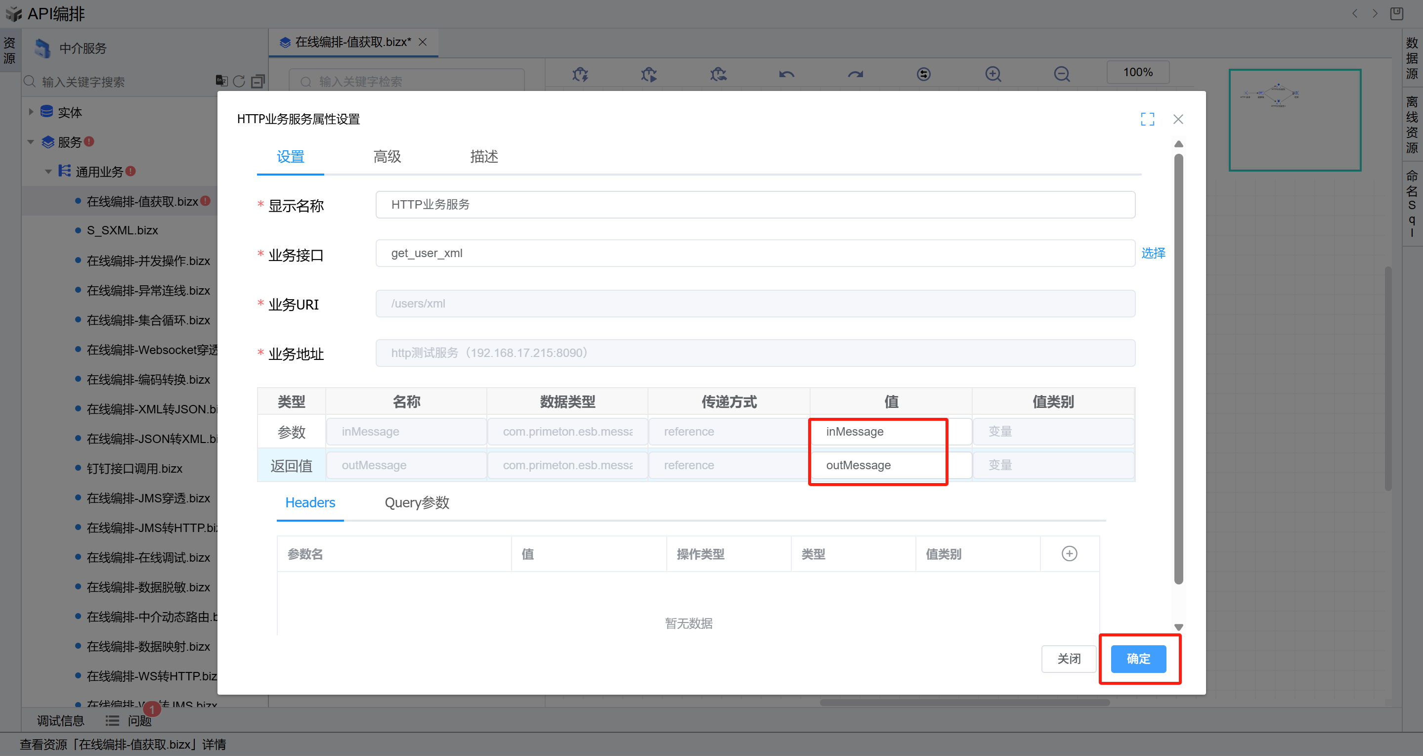 接口,然后点击确定。然后回到HTTP业务服务图元, 参数选择outMessage