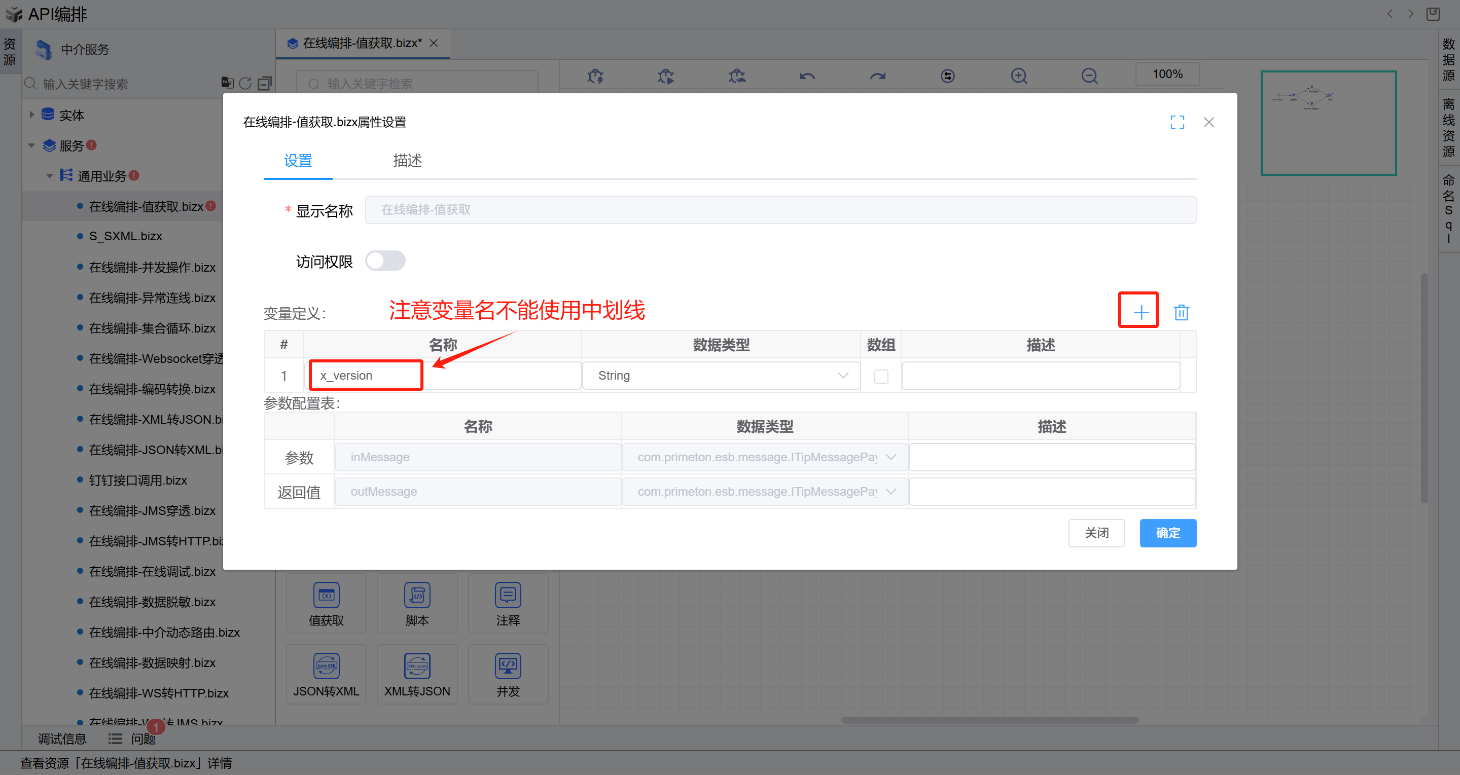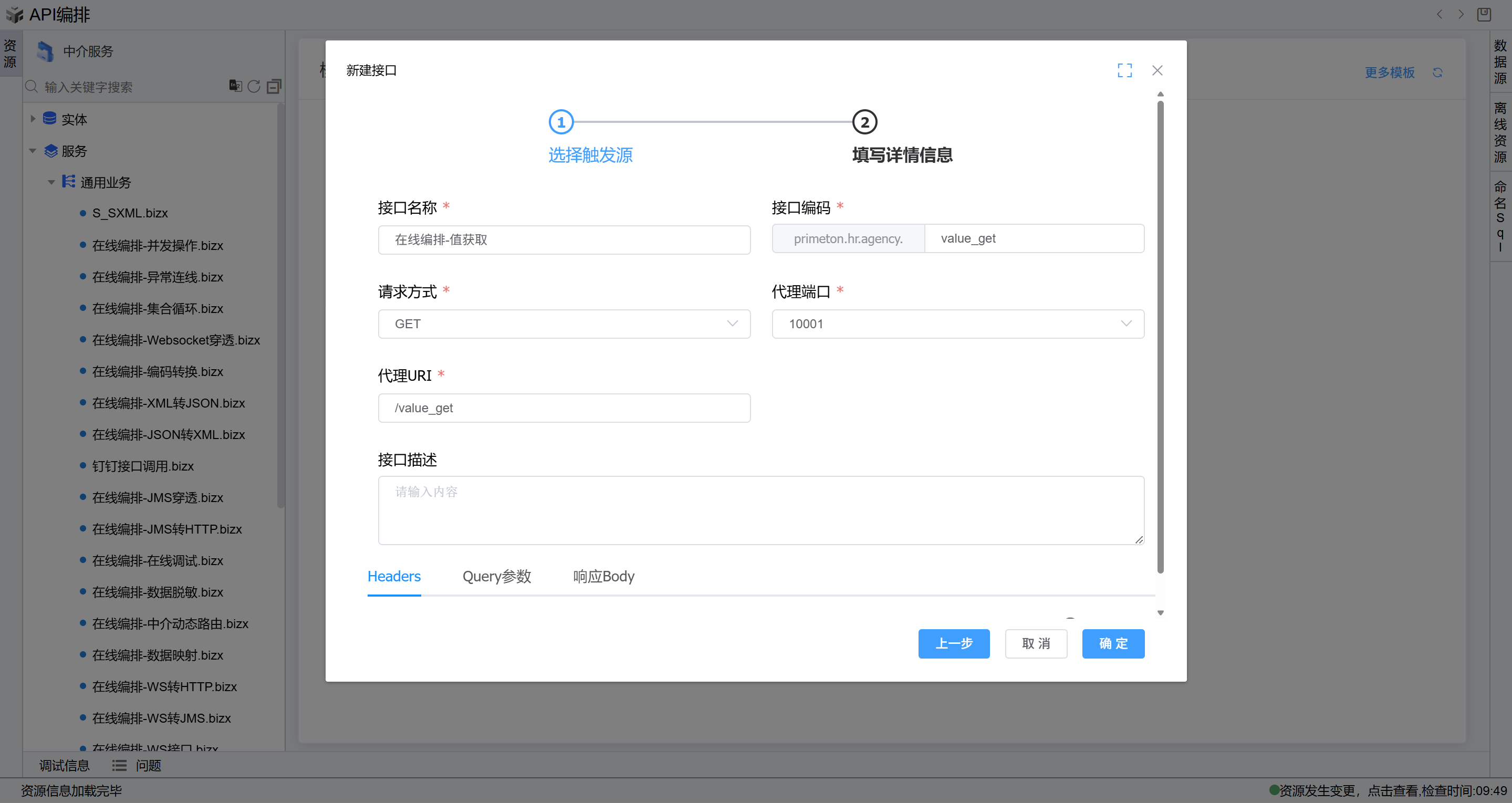 - 选择左侧树上中介服务节点,点击API创建按钮,选择右侧的”API编排“页签,点击”API编排“按钮,进入在线编排页面。