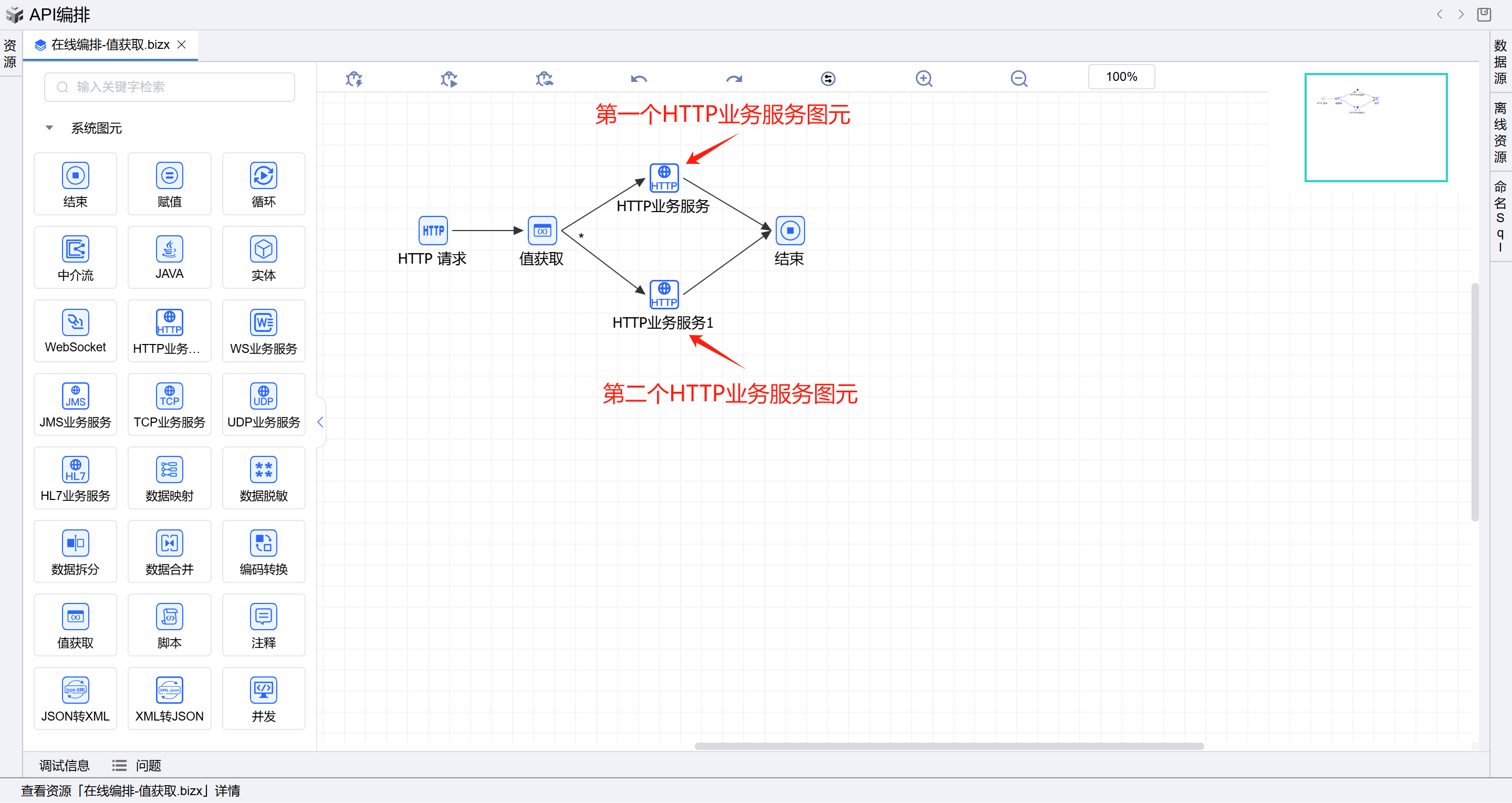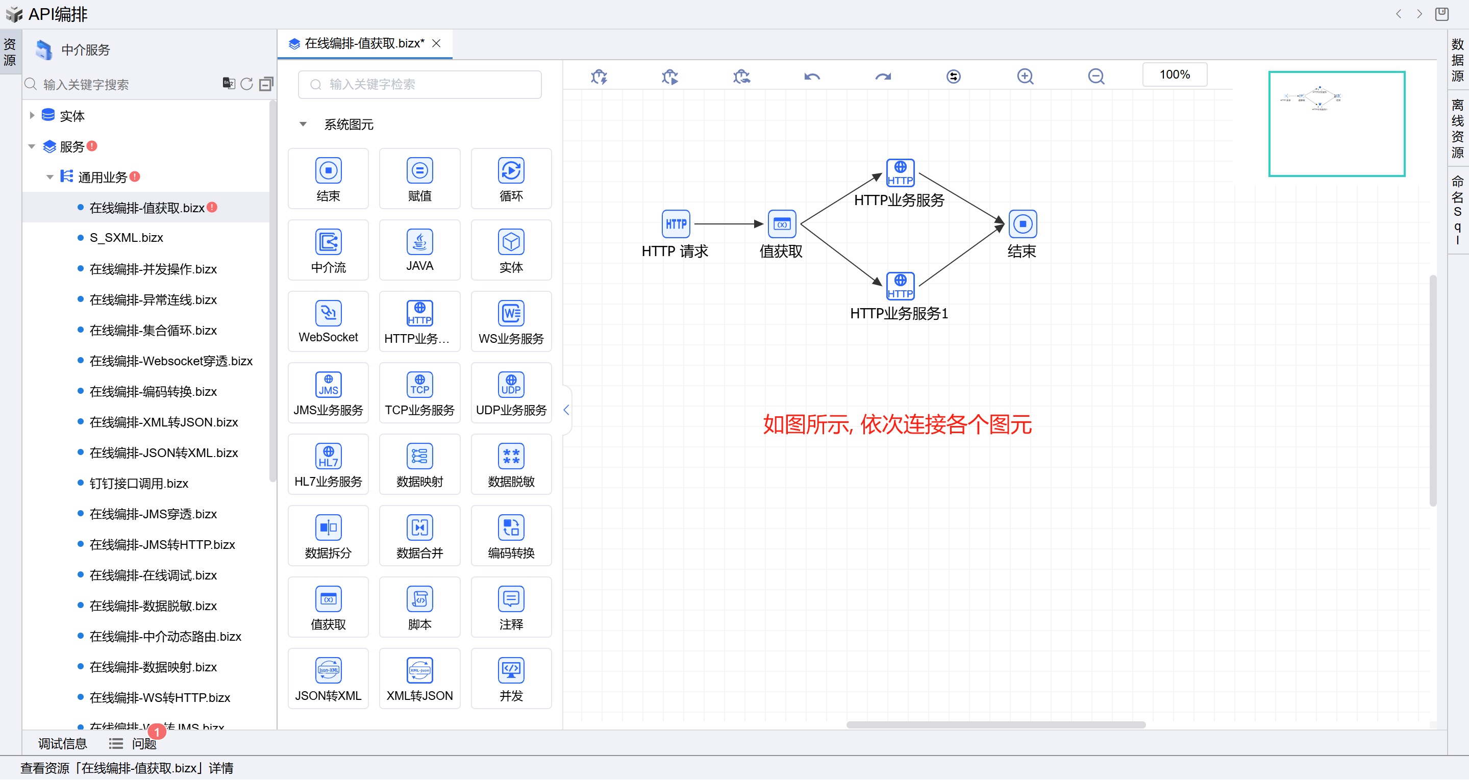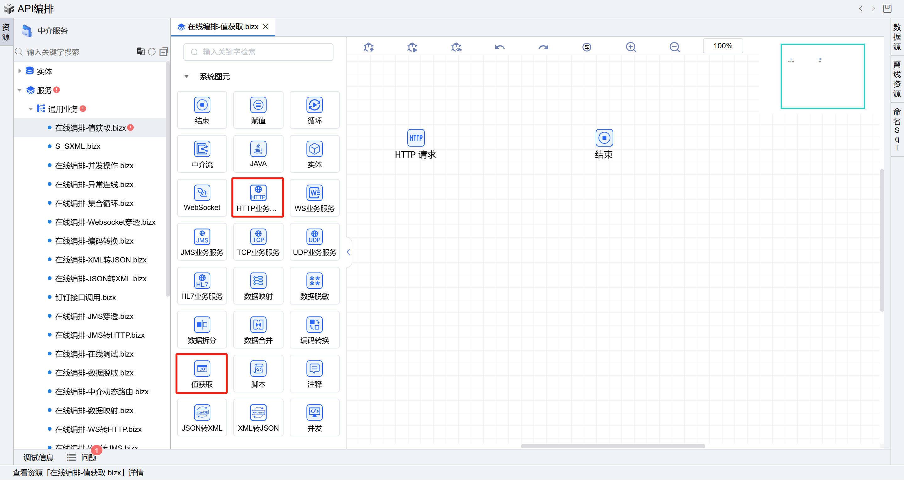 - 保存成功后系统自动打开中介编排页面,如下图所示。从左侧拖一个值获取图元和两个HTTP图元到开始和结束图元中间并依次连接各个图元。如下图: