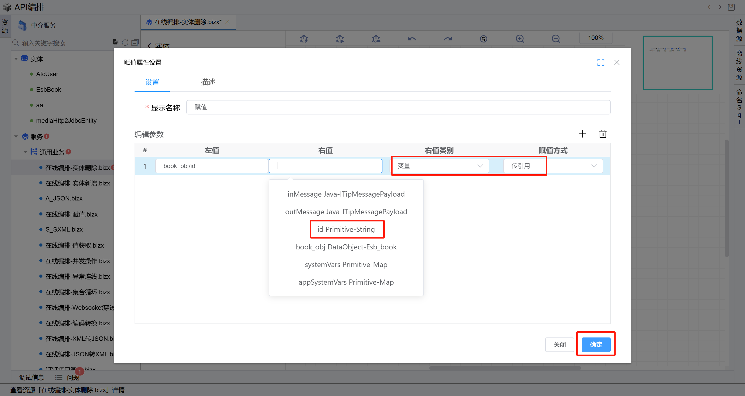 ,右值类型选择“变量“, 点击“确定”按钮保存。此操作的目的是将从报文头获取相关字段赋值给实体属性。如下图: