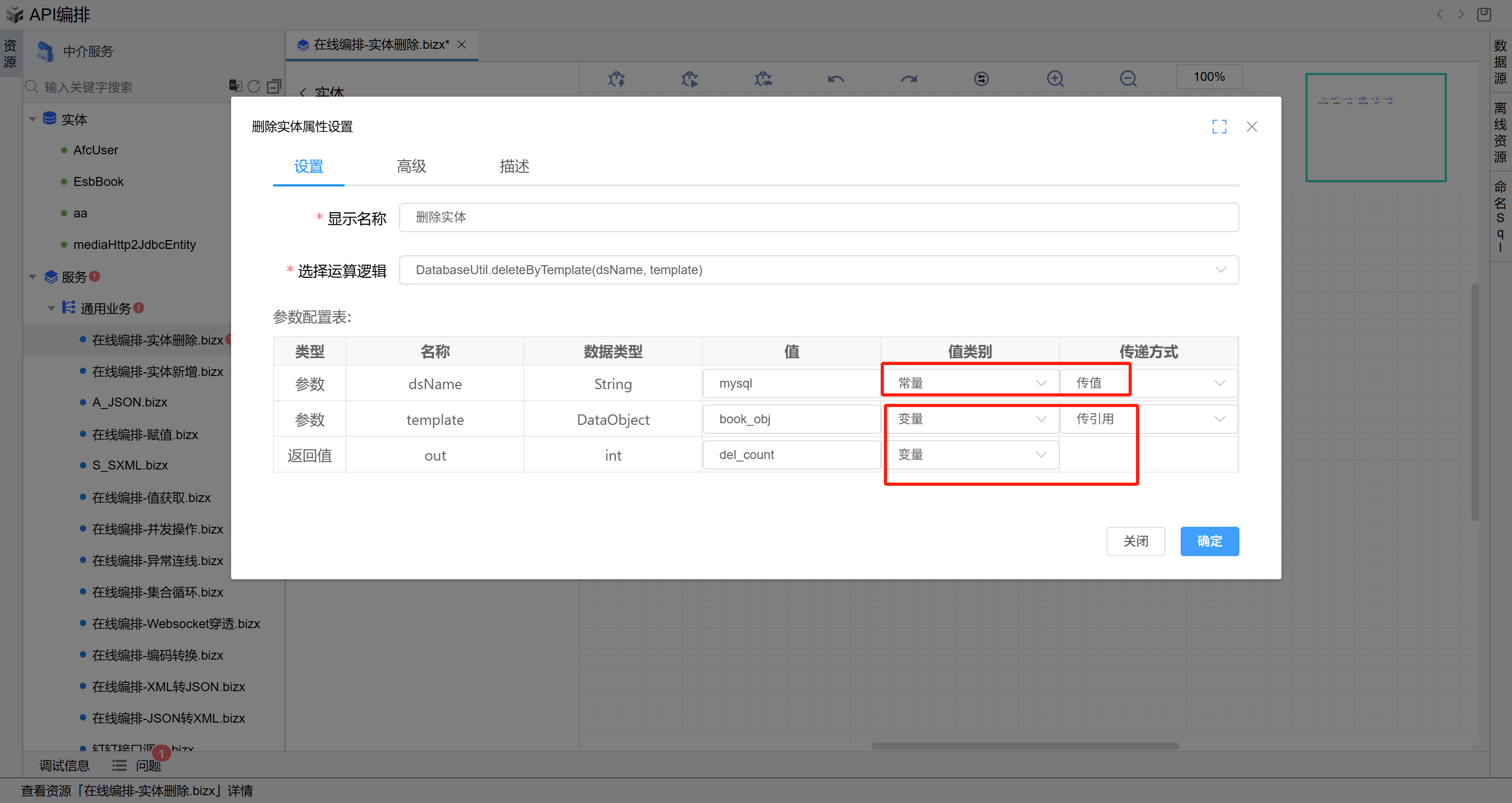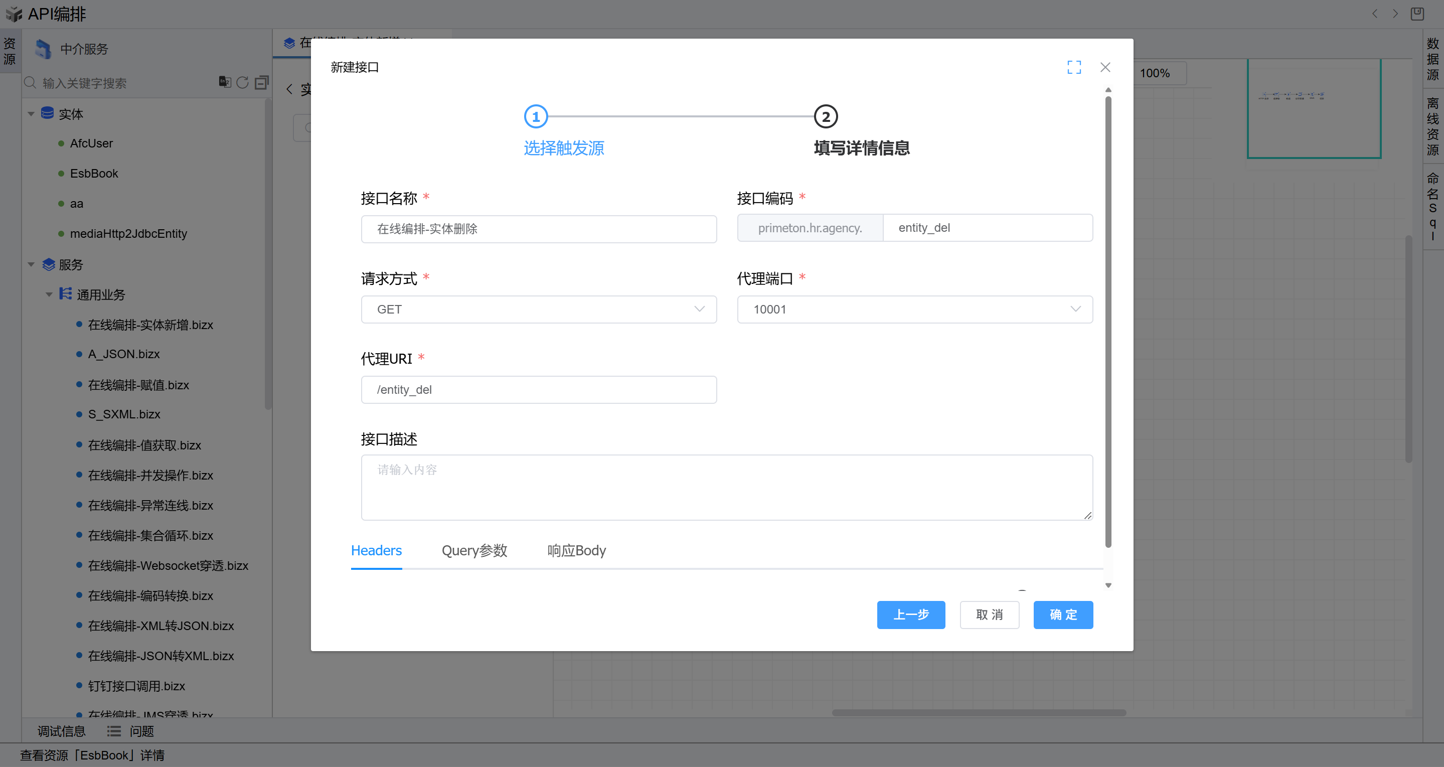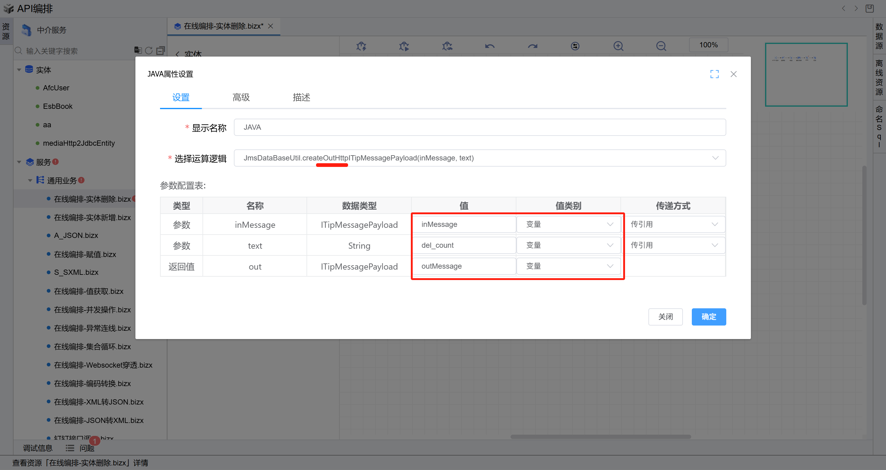 - 选择左侧树上中介服务节点,点击API创建按钮,选择右侧的”API编排“页签,点击”API编排“按钮,进入在线编排页面。