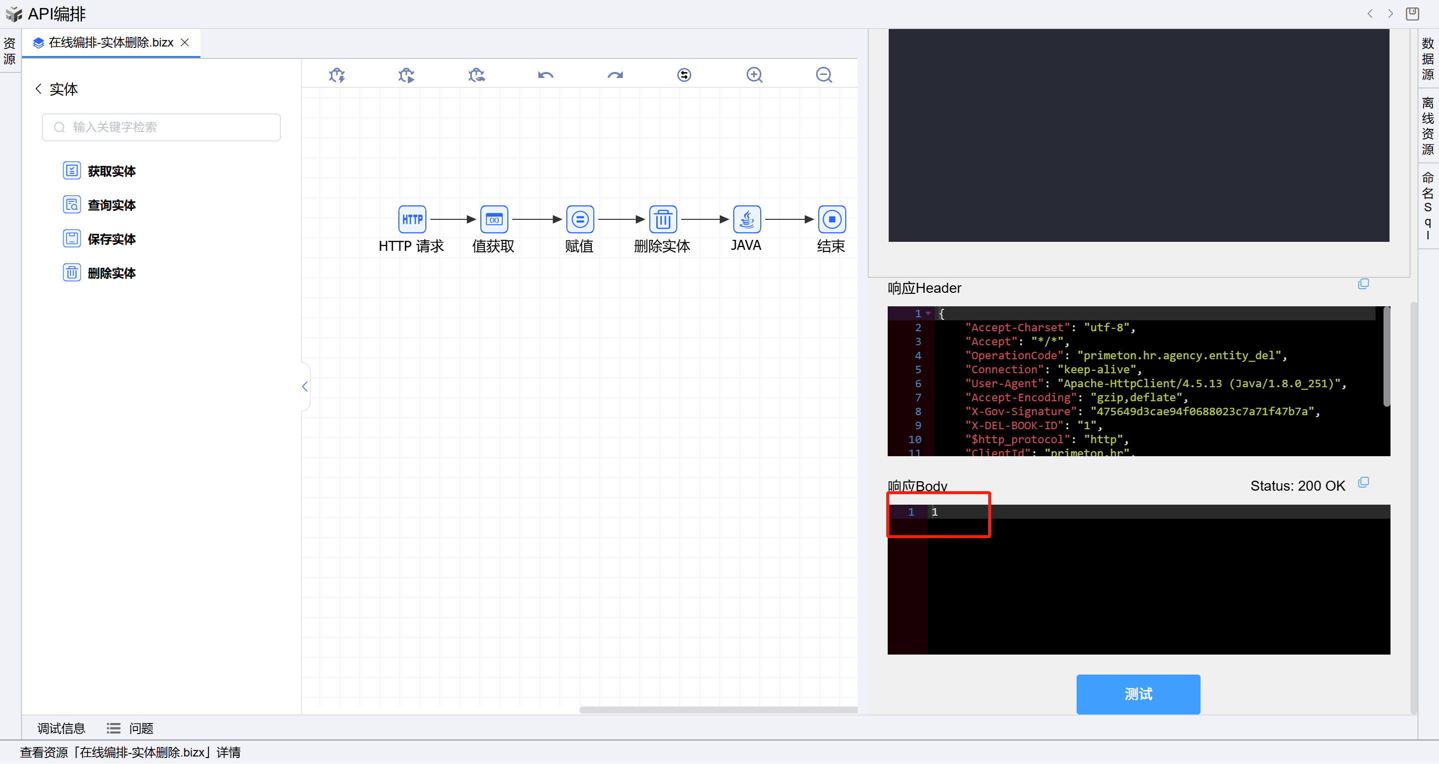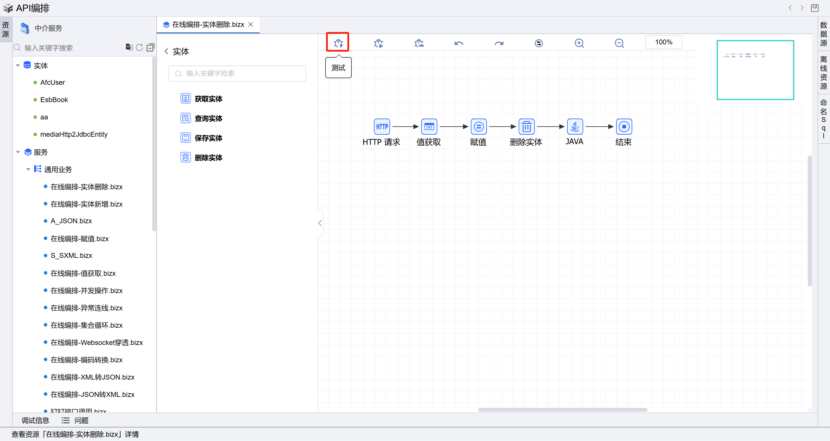 - 在线编排页面保存成功后,点击界面上方的测试按钮,如下图:
