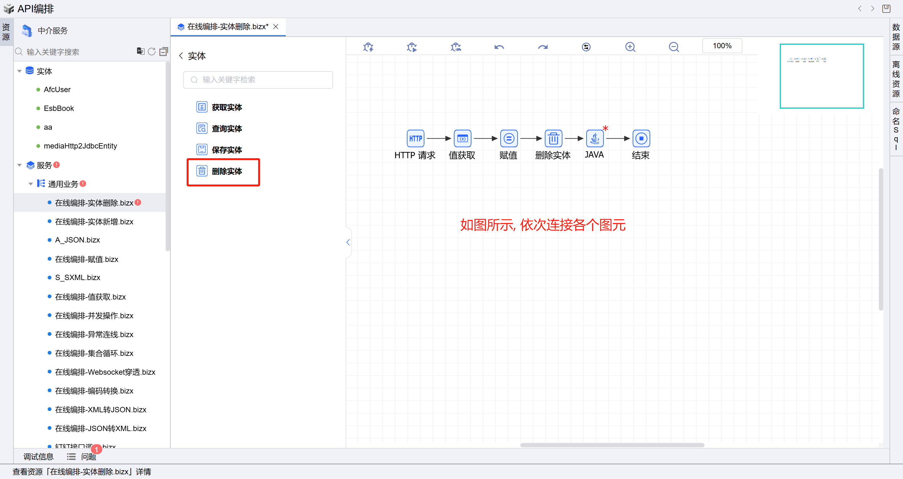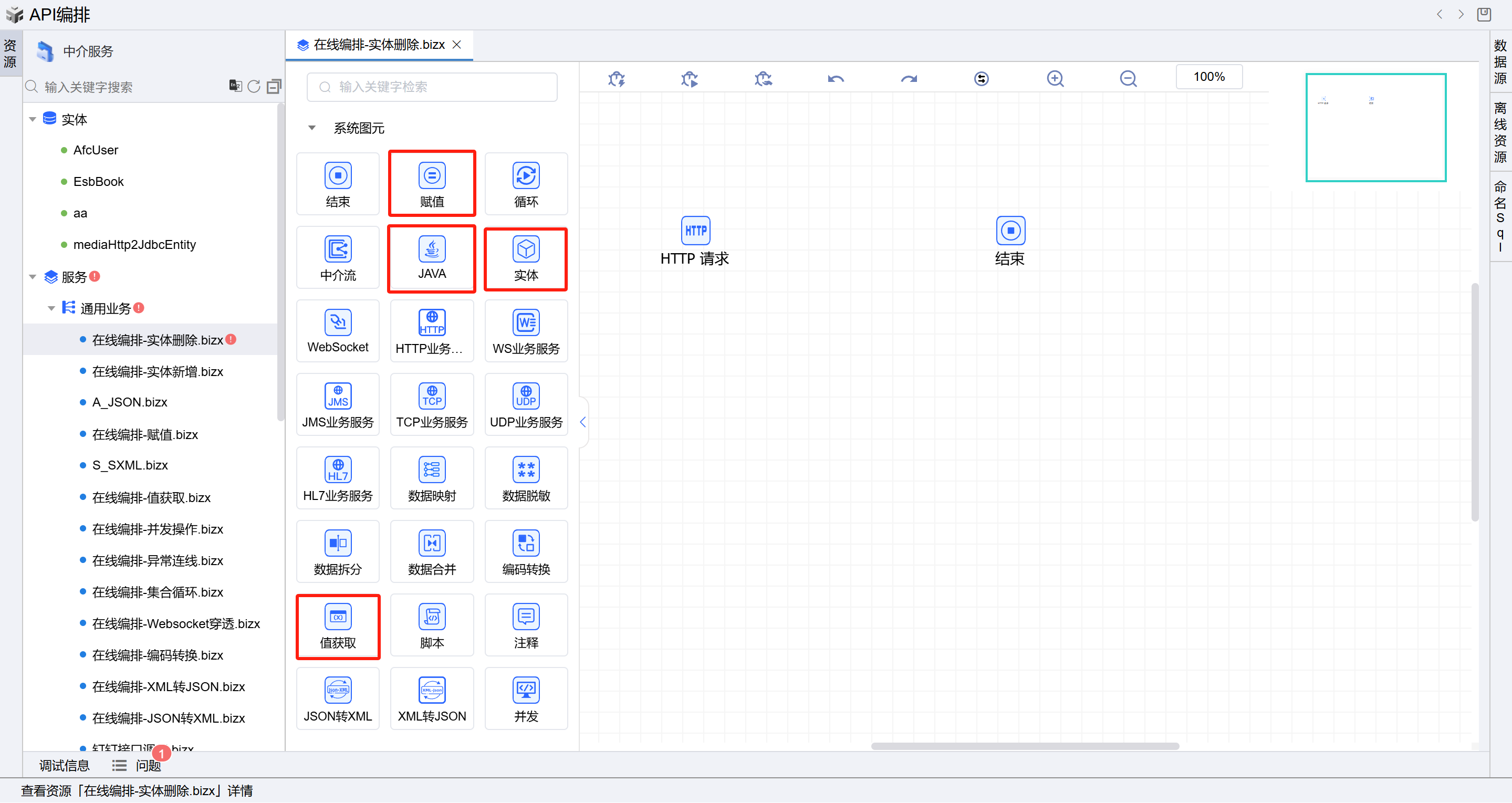 - 保存成功后系统自动打开中介编排页面,如下图所示。从左侧拖一个值获取图元、一个赋值图元、一个JAVA图元,单击实体图元,拖动删除实体图元到右侧画布的HTTP请求和结束图元之间,并如图所示依次连接所有图元。如下图: