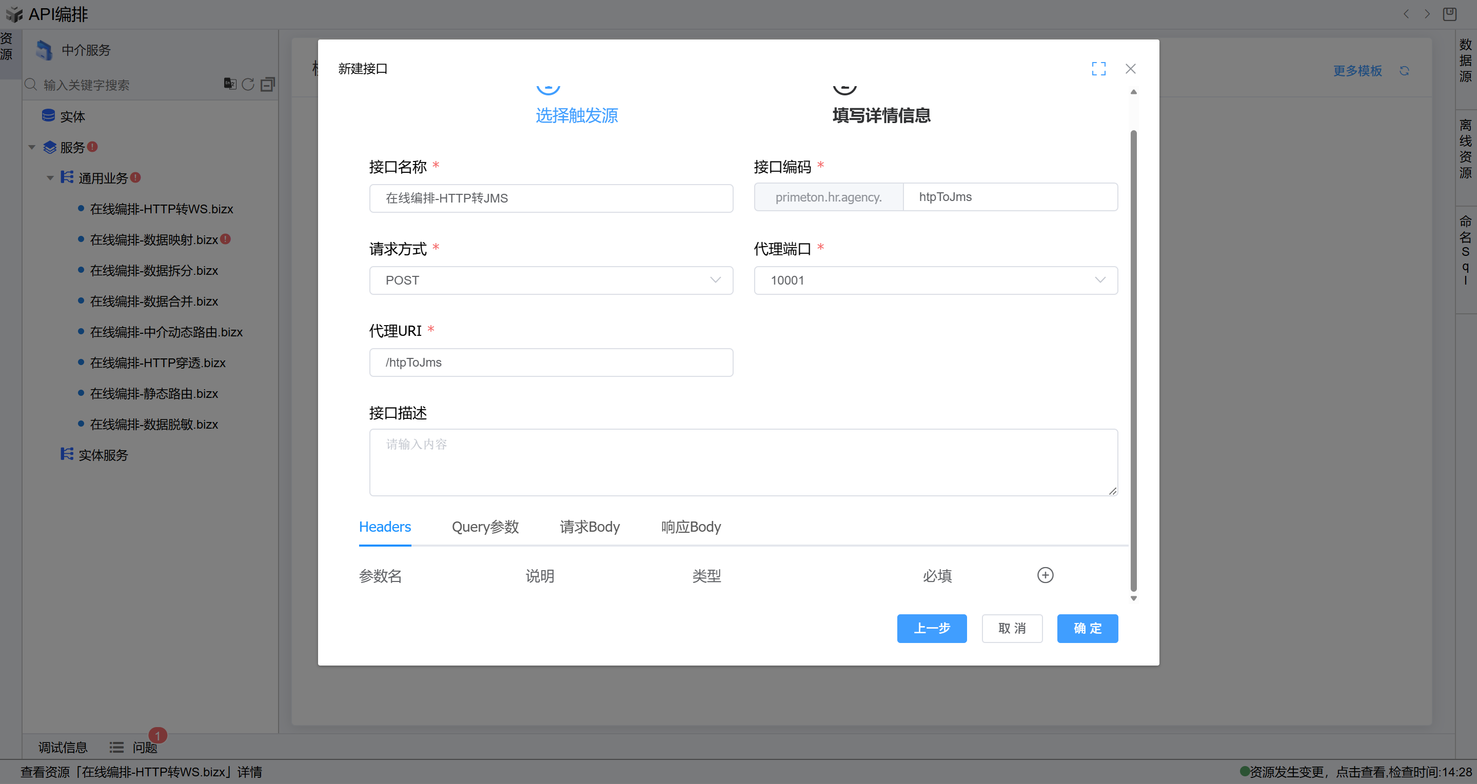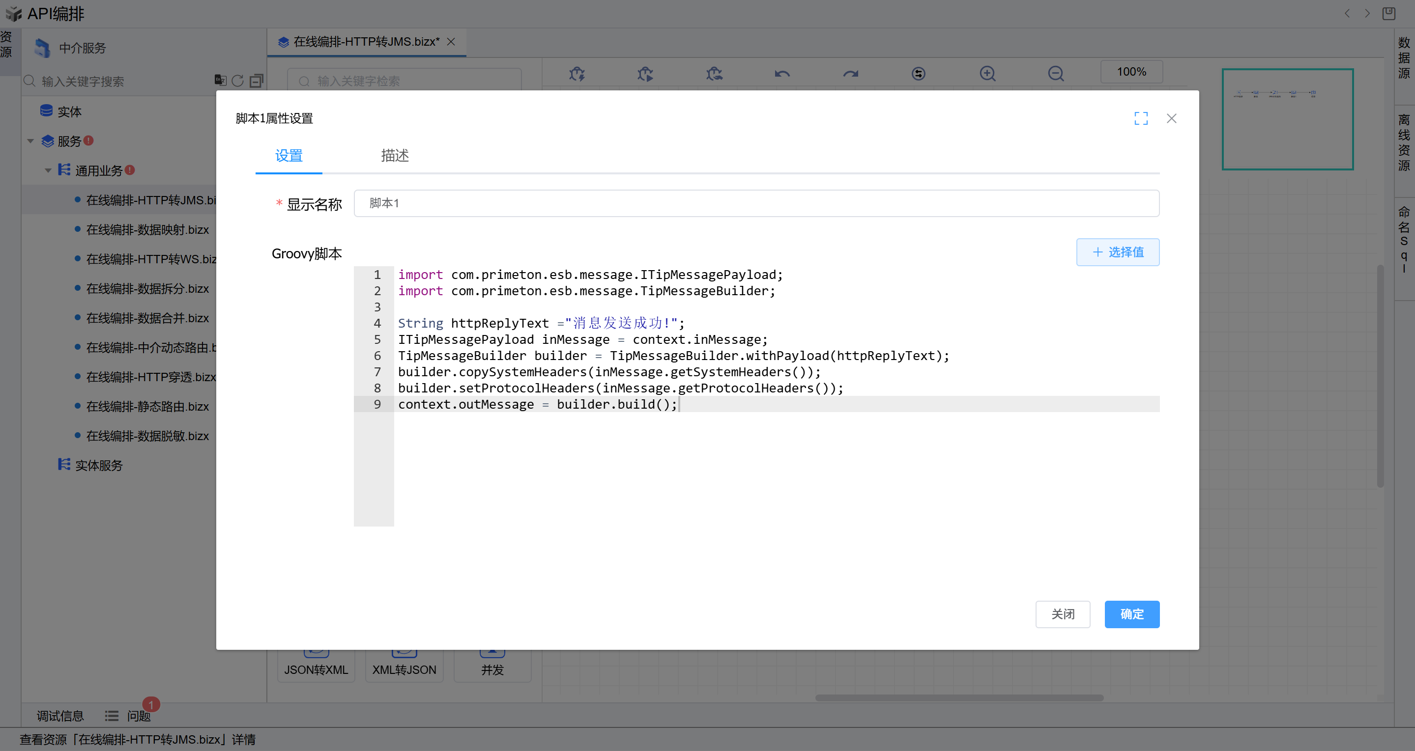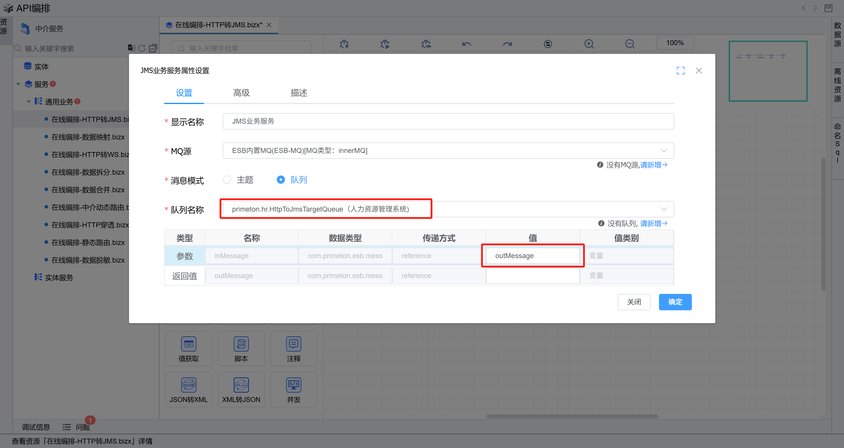双击打开第一个HTTP转JMS图元,配置参数和返回值。如下图: