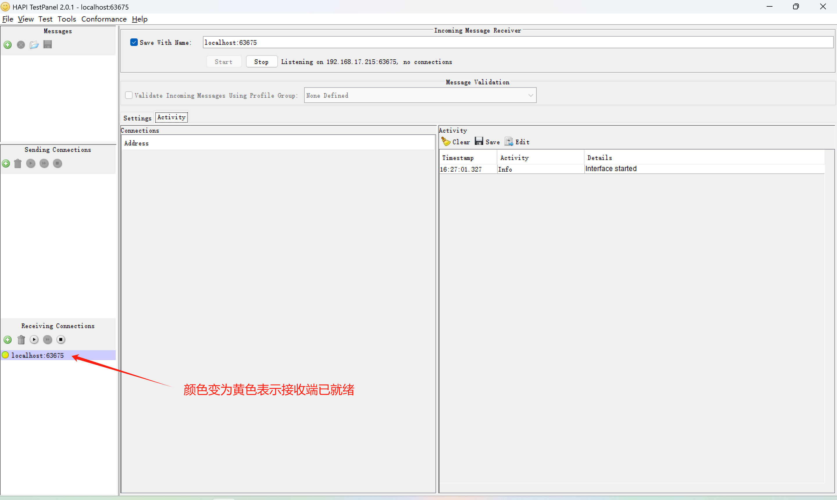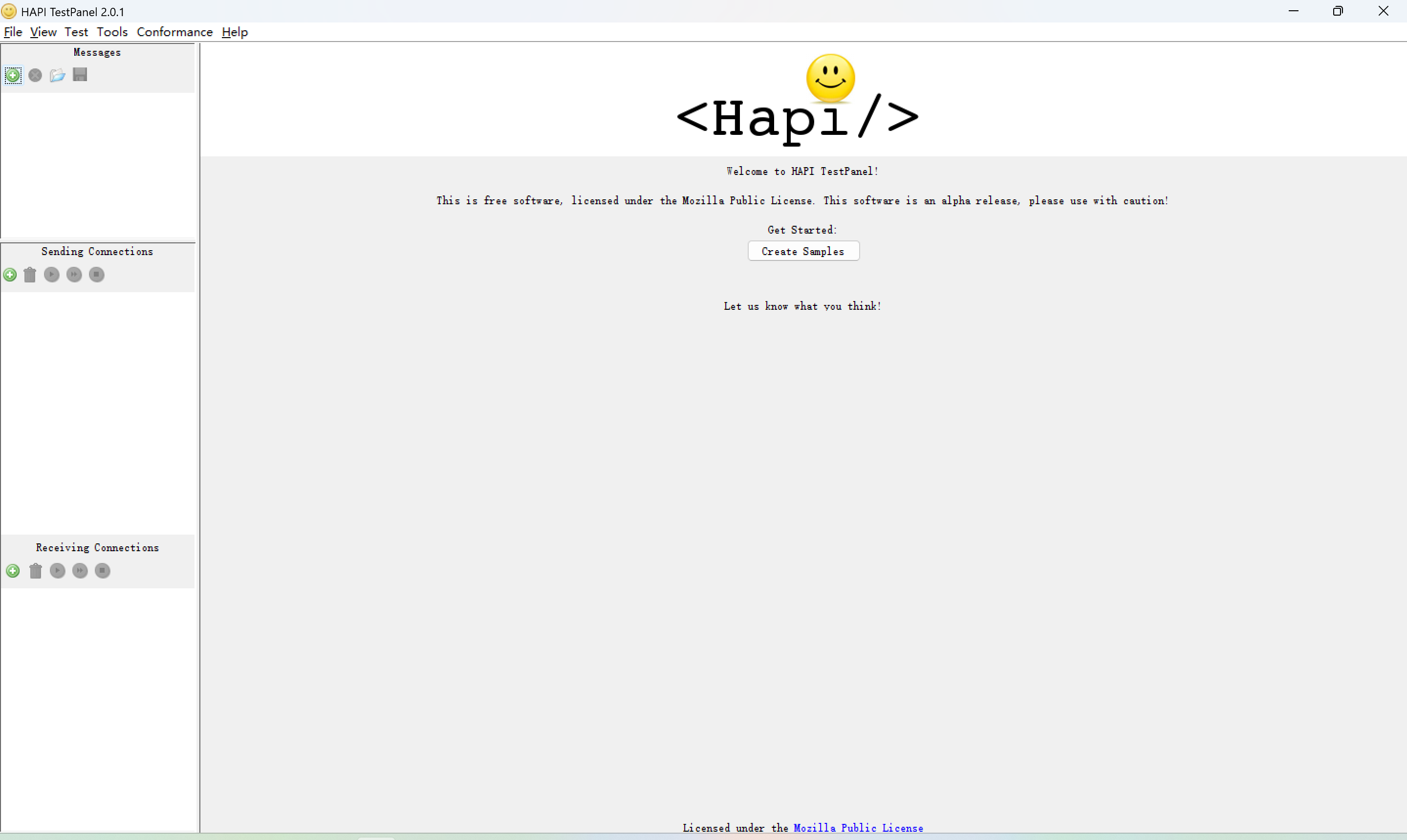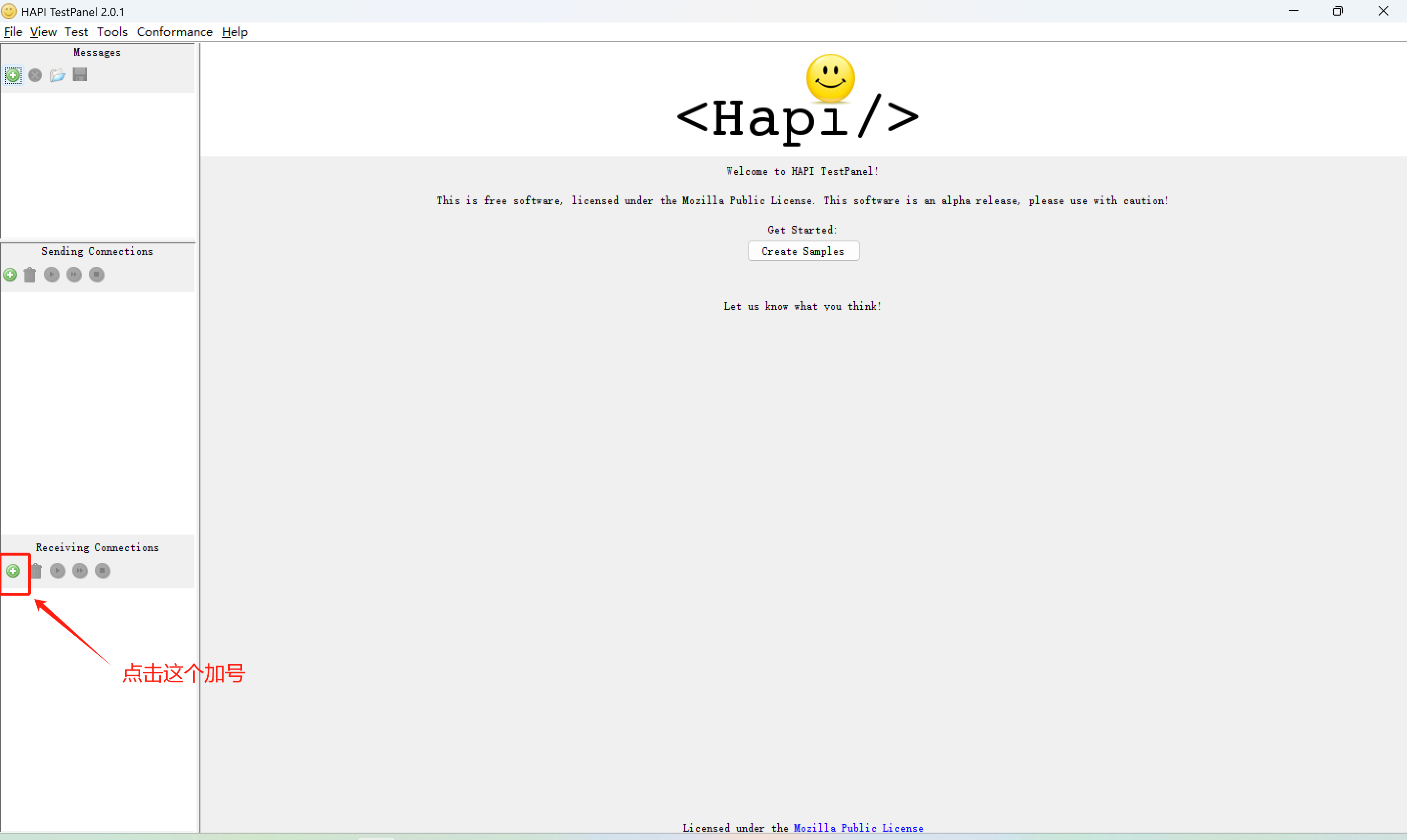 1. 下载HL7调试工具hapi-testpanel-2.0.1-windows.zip,下载后解压打开文件夹双击testpanel.exe启动工具。如下图: