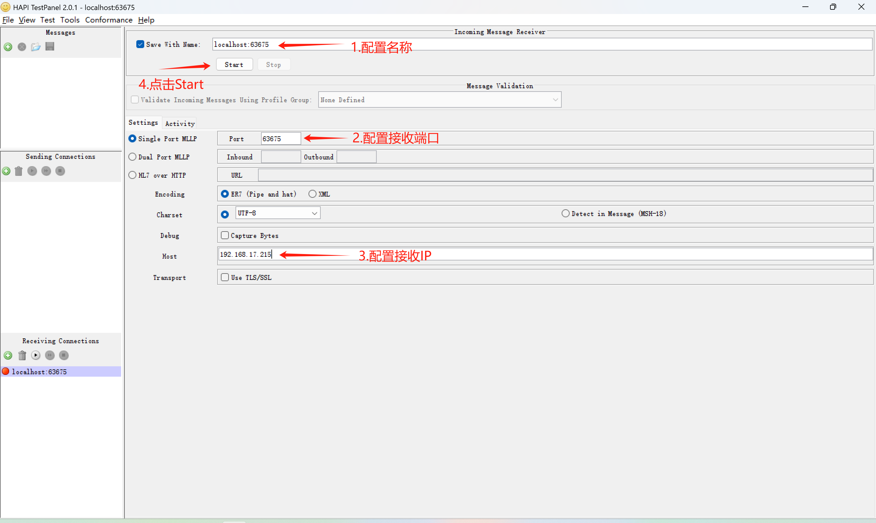 2. 点击左下方的加号如下图所示,创建HL7消息接收端也就是业务地址。
