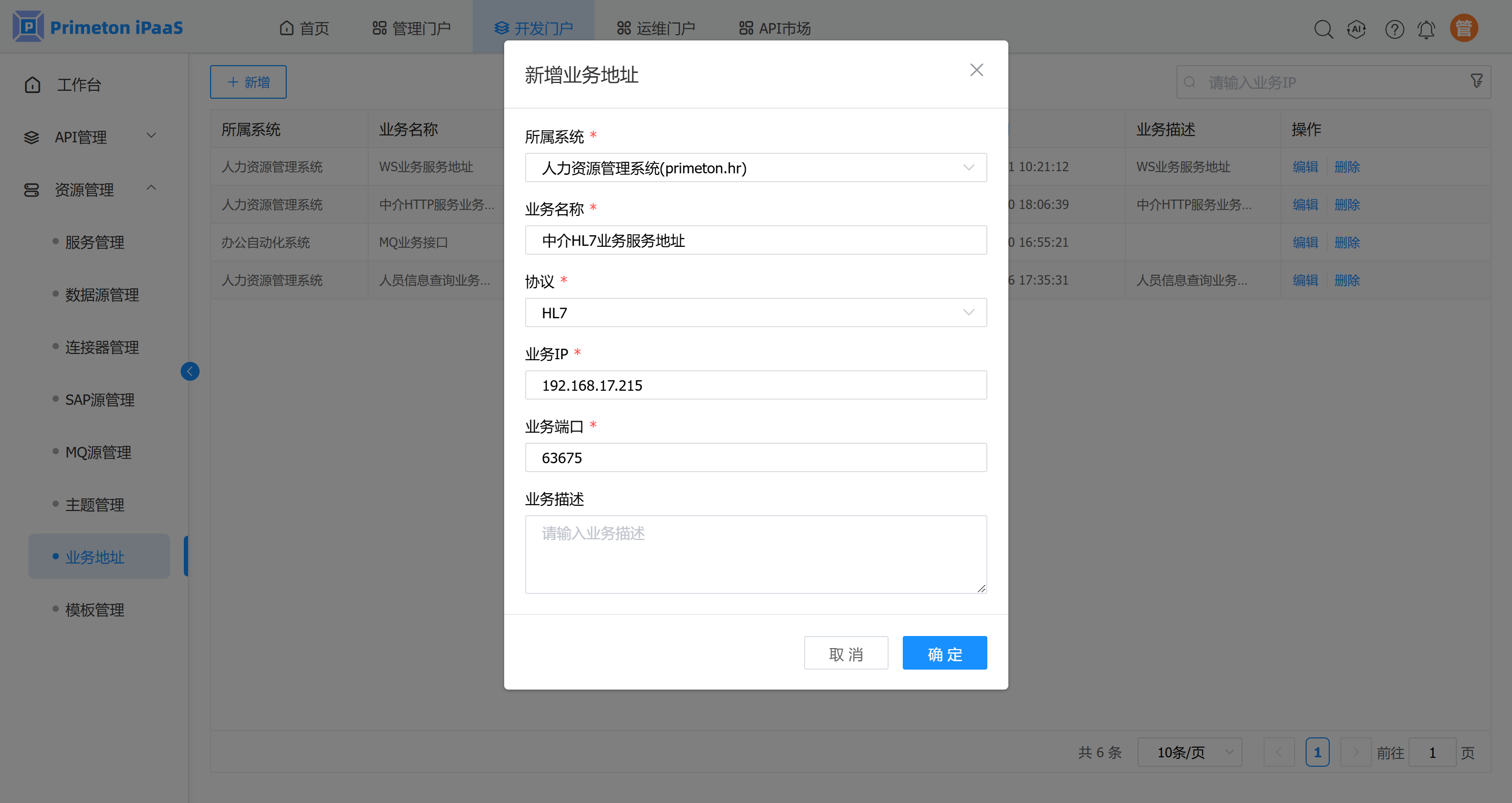 3. 在【资源管理】/【业务地址】页面,新增业务服务地址并点击确定保存。(如果已经创建过,则请忽略此步骤)如下图: