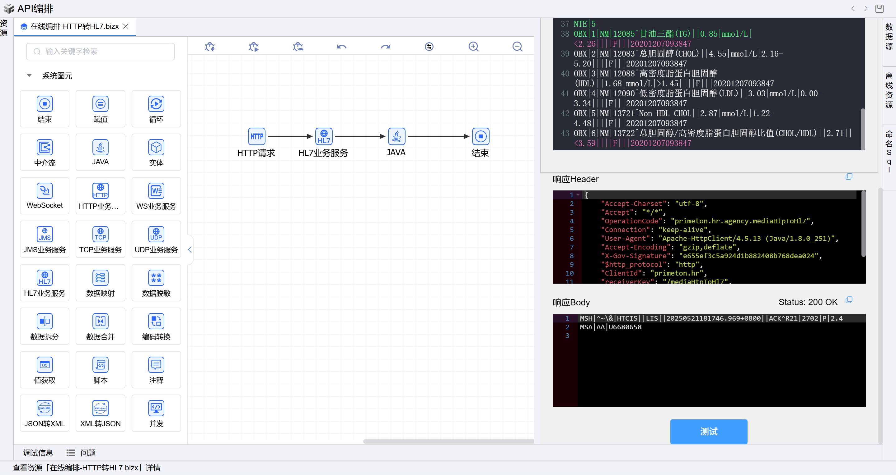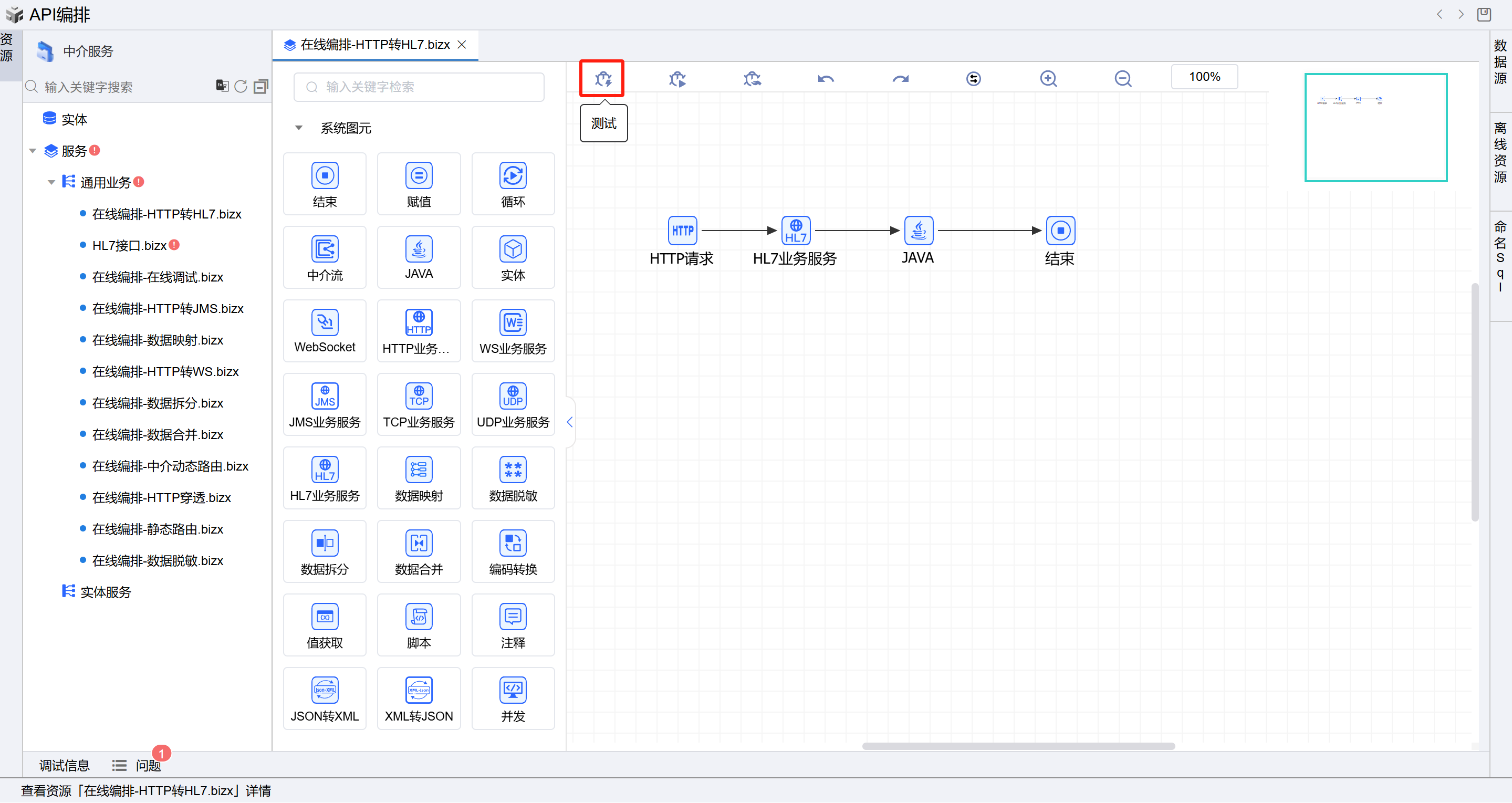 1. 在线编排页面保存成功后,点击界面上方的测试按钮,如下图:
