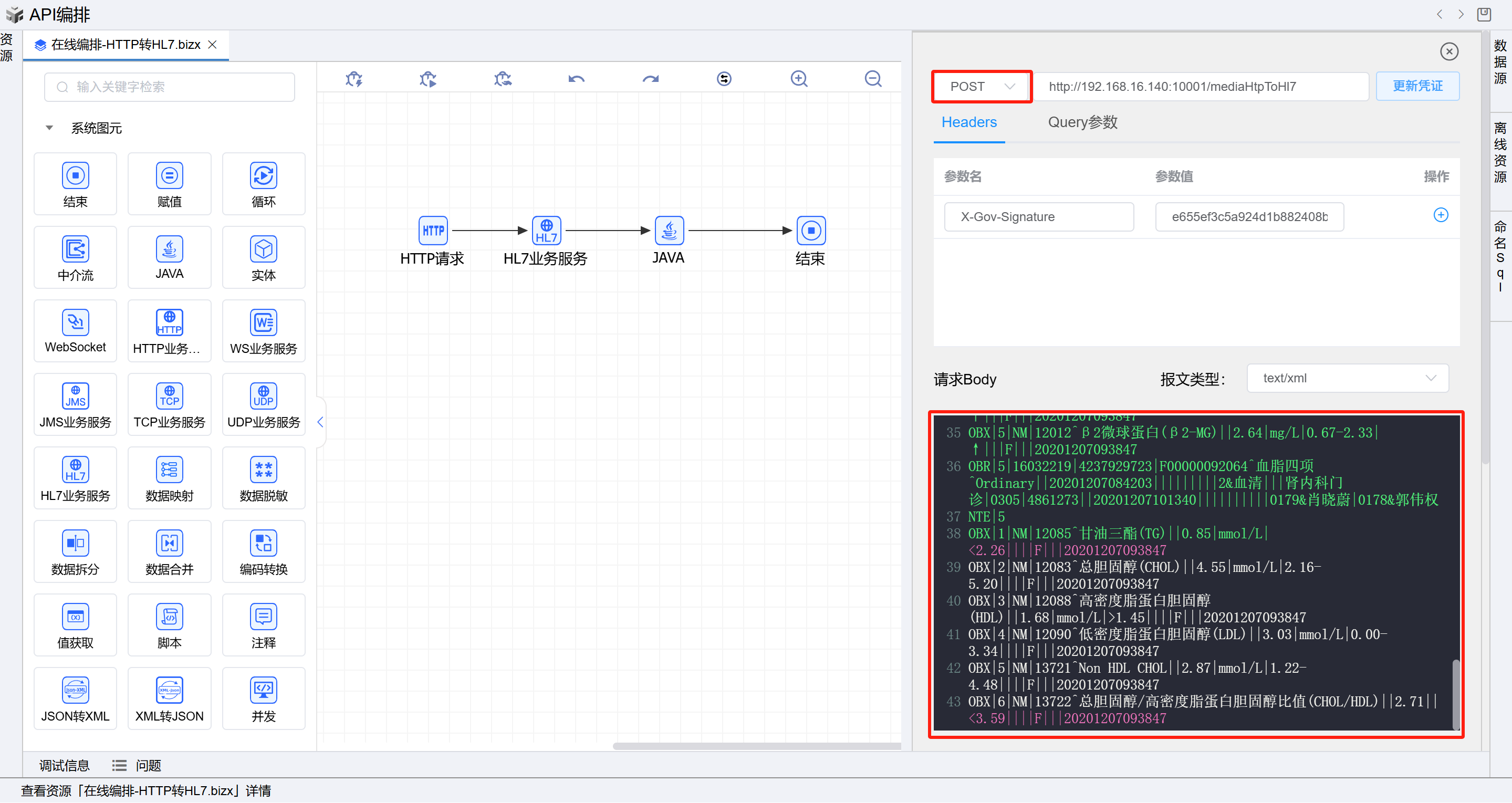 2. 打开测试界面,填写请求内容body体需要将文件HL7Message.hl7的内容复制进去。如下图:
