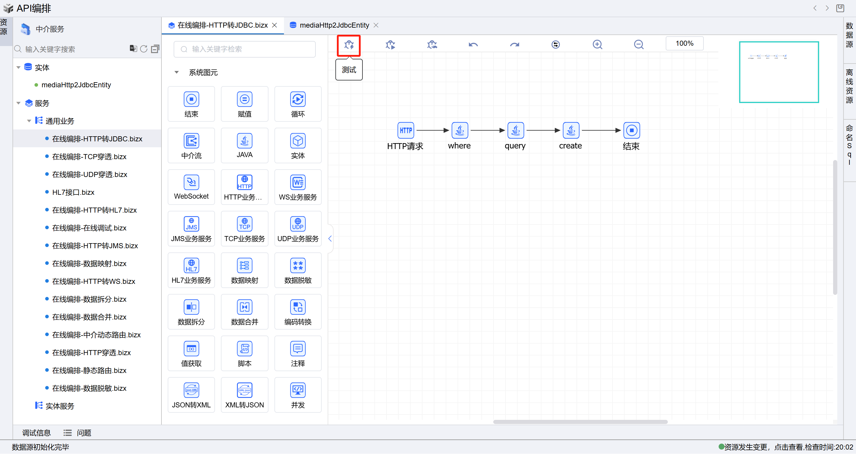 在线编排页面保存成功后,点击界面上方的测试按钮,如下图:
