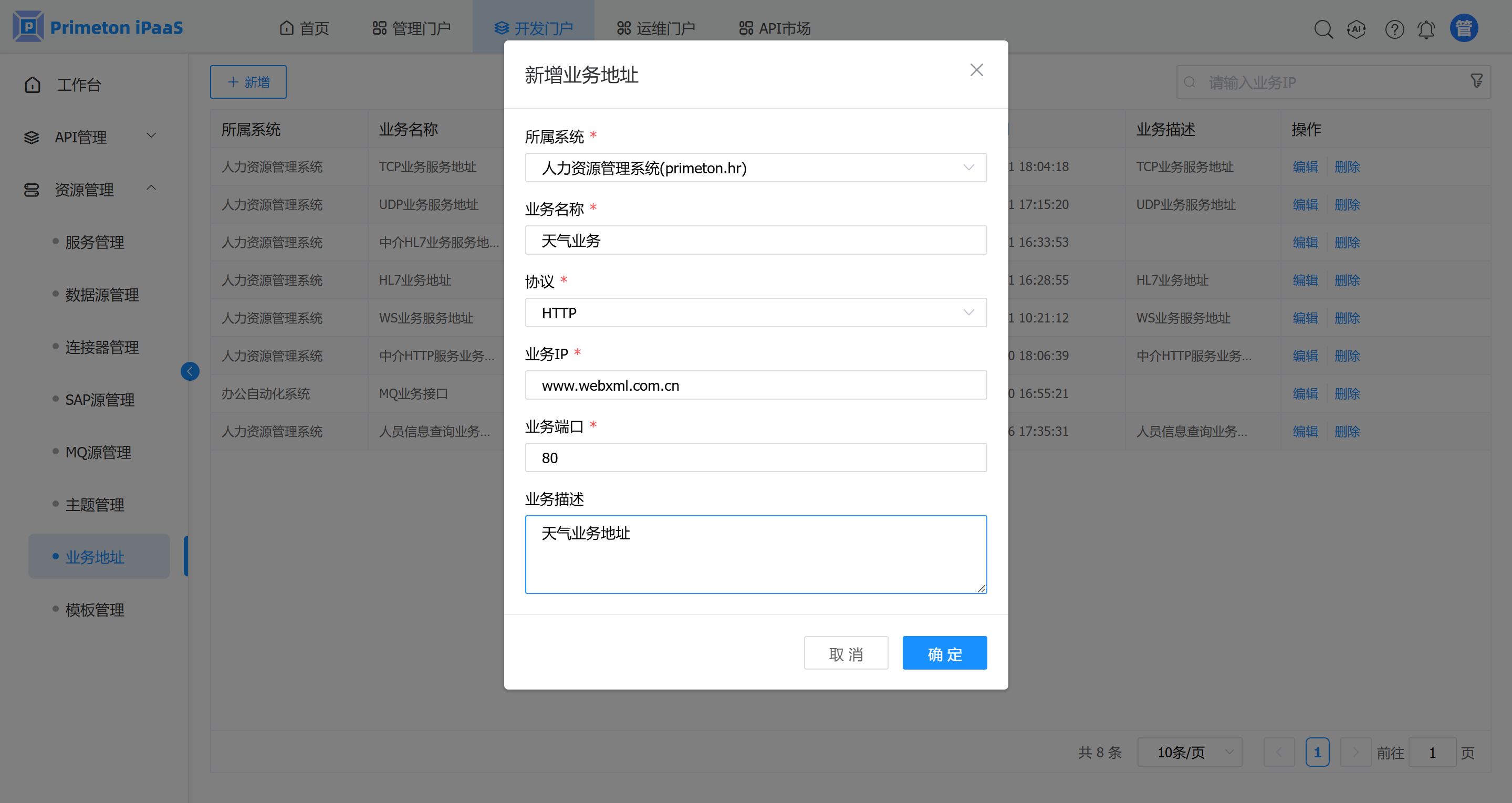 本次我们使用的业务服务为天气预报WebService服务http://www.webxml.com.cn/WebServices/weatherwebService.asmx?wsdl (opens new window)。 在【资源管理】/【业务地址】页面,新增业务服务地址,点击确定保存;(如果已有则不用重新创建)。如下图: