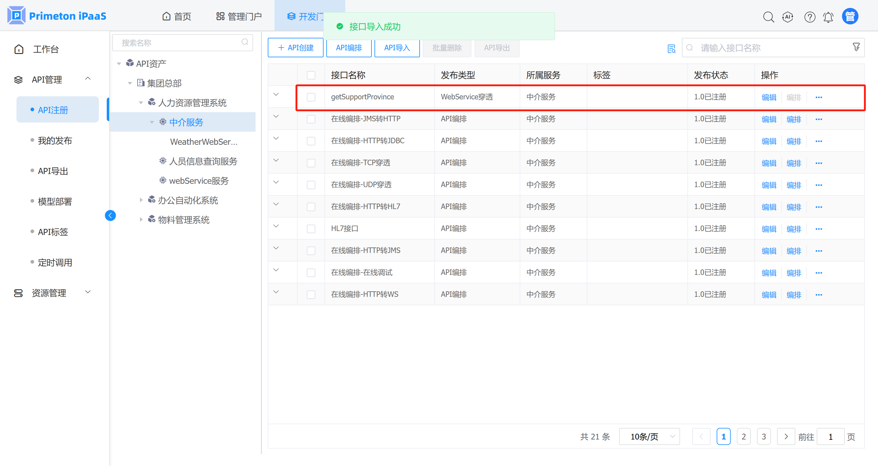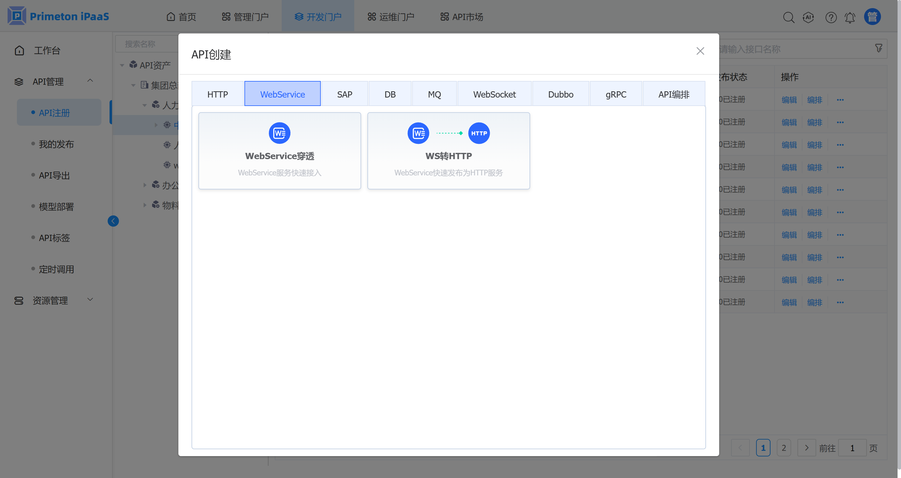 然后在中介服务下,点击API创建,在API创建对话框中选择webService穿透。(如果已经导入则不用执行此操作)如下图: