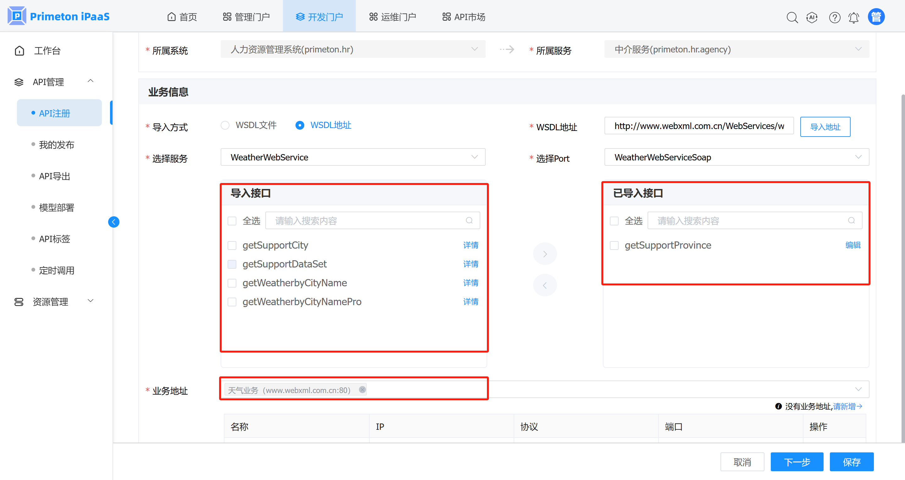 填写wsdl地址http://www.webxml.com.cn/WebServices/weatherwebService.asmx?wsdl (opens new window) ,点击导入,导入要使用的接口,选择我们刚才创建的业务服务地址后点击保存。