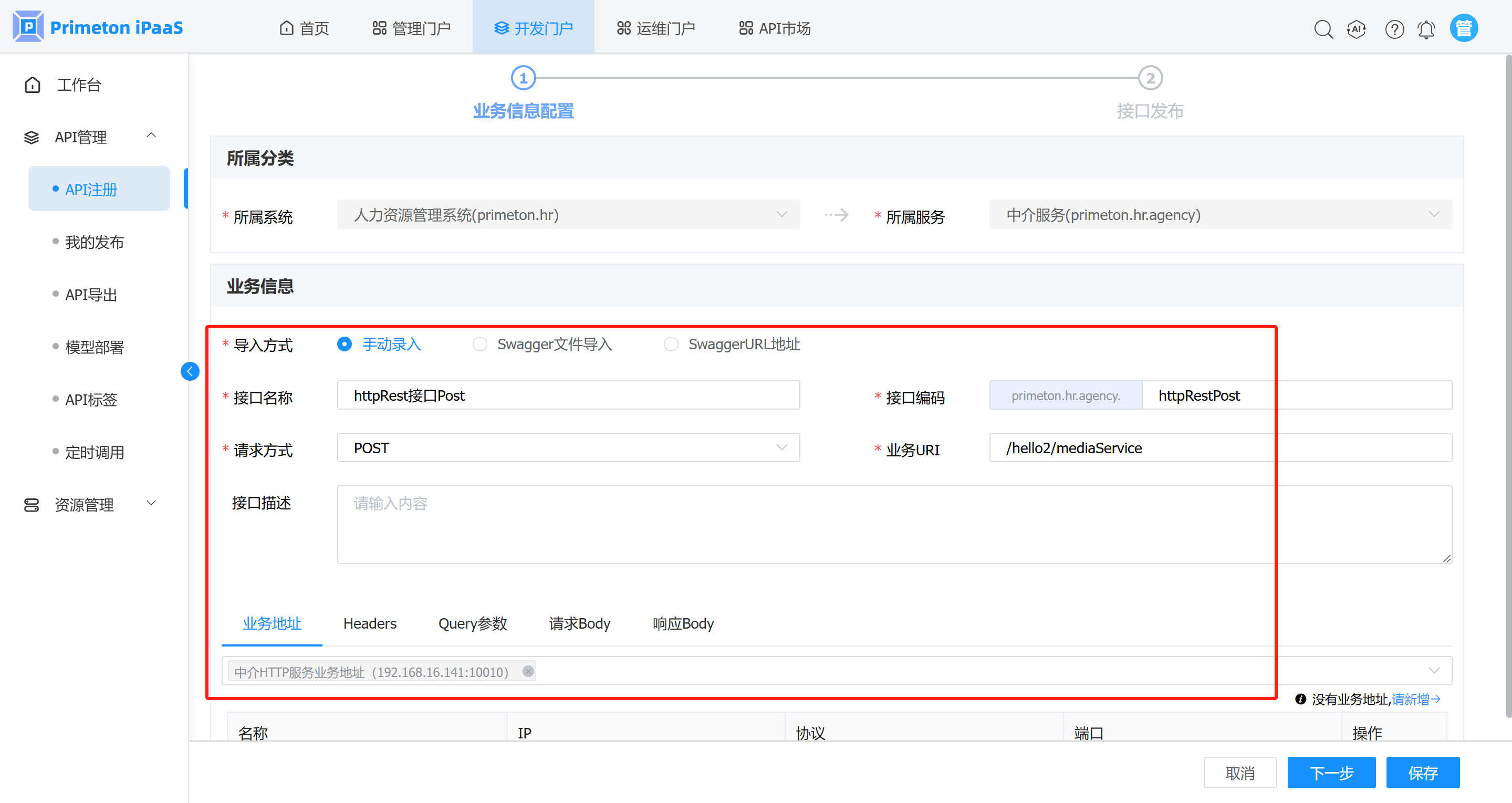 本次我们使用的业务服务为httpdemo-1.jar,打开方式为在命令行下面输入java -jar httpdemo-1.jar。在【资源管理】/【业务地址】页面,新增业务服务地址,点击确定保存。如下图: 注:业务IP和业务端口分别填写运行Jar的服务器的ip和端口10010