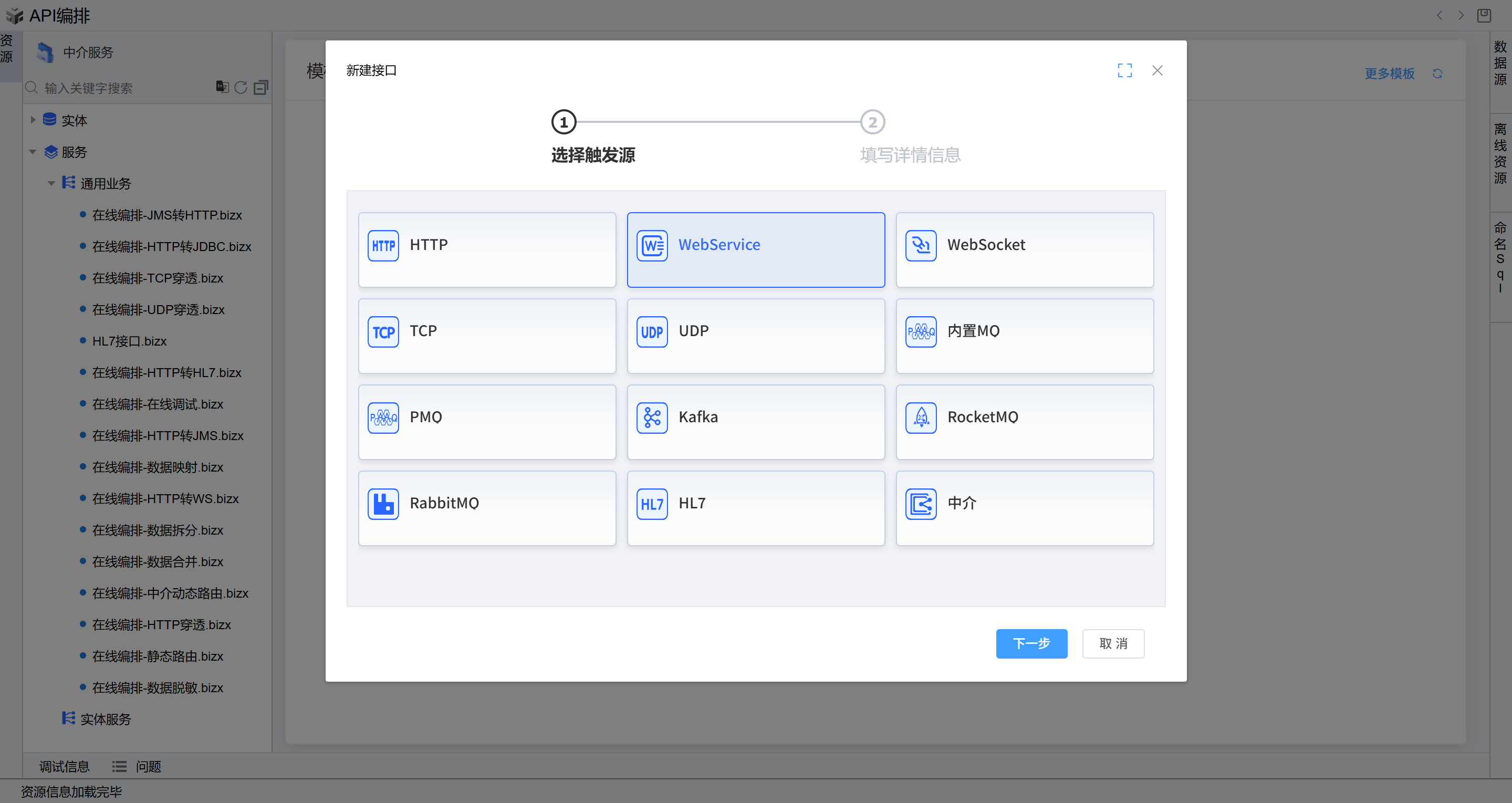 选择左侧树上中介服务节点,点击API创建按钮,选择右侧的”API编排“页签,点击”API编排“按钮,进入在线编排页面。