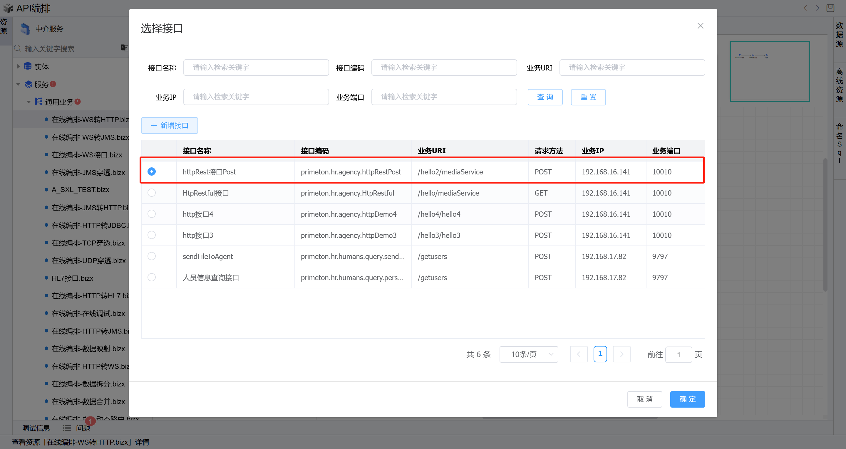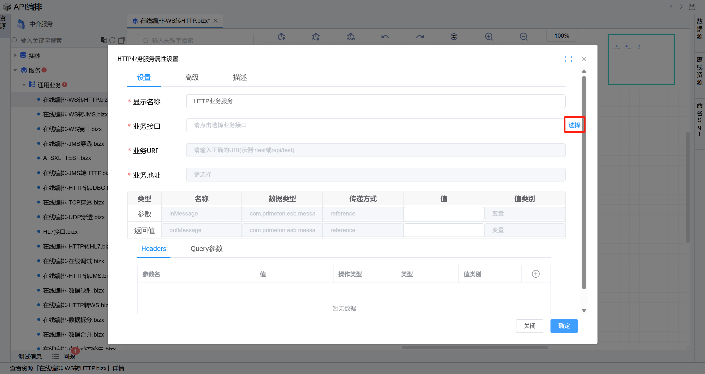 双击打开HTTP业务服务图元后,业务地址右侧点击选择按钮,在选择接口页面选择之前新增的接口,点击确定按钮。 回到HTTP业务服务属性设置页面,在下方表格中的参数和返回值分别选择inMessage和outMessage,然后点击确定按钮关闭对话框。如下图: