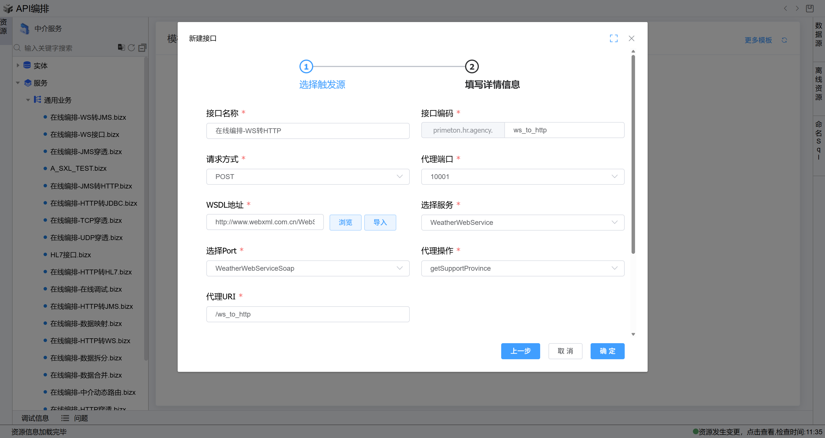 在线编排页面中,在通用业务目录上点击右键并点击新建,点击新建API接口,选择WebService,然后如下图所示填写数据并点击保存确定。