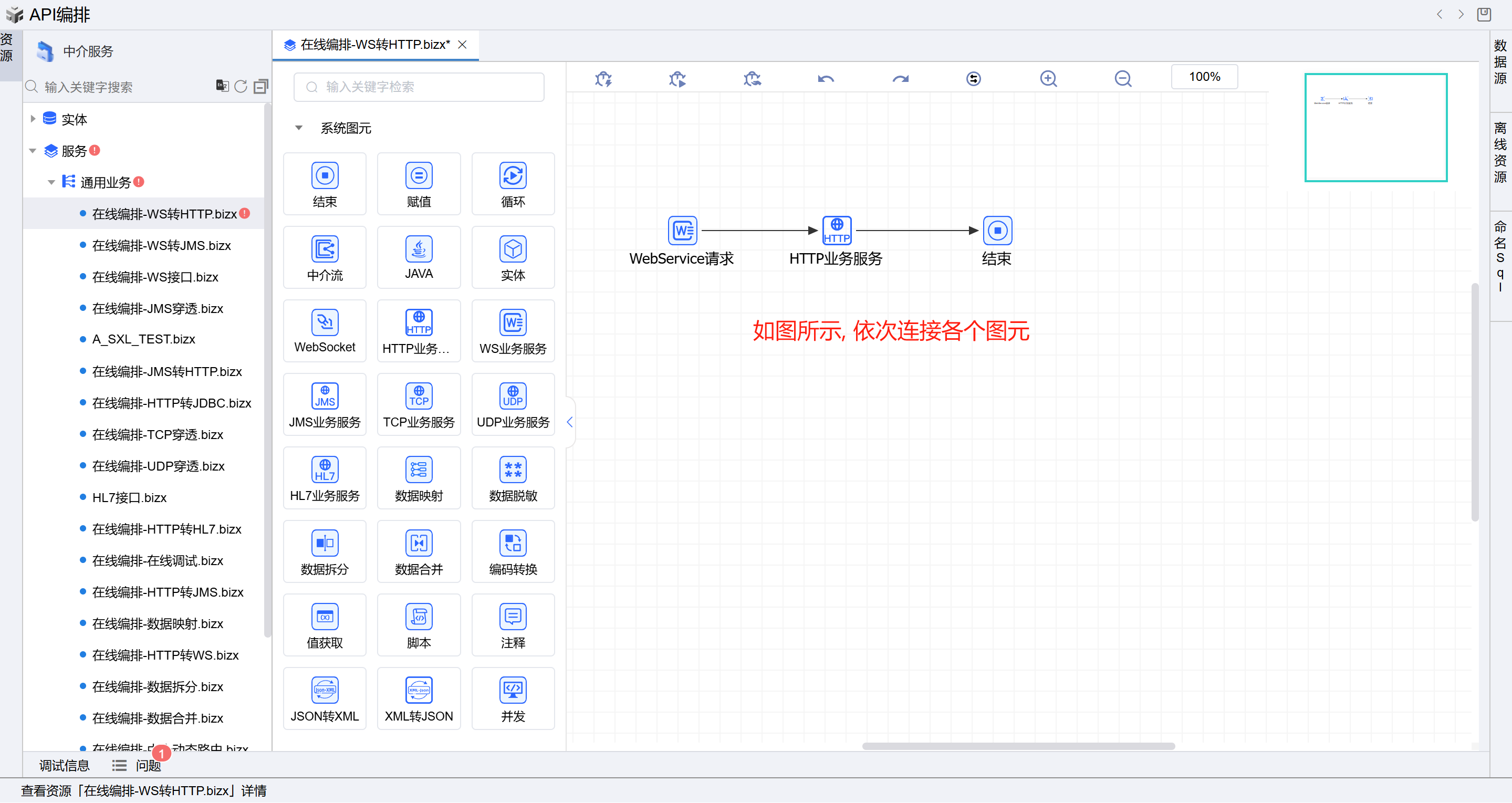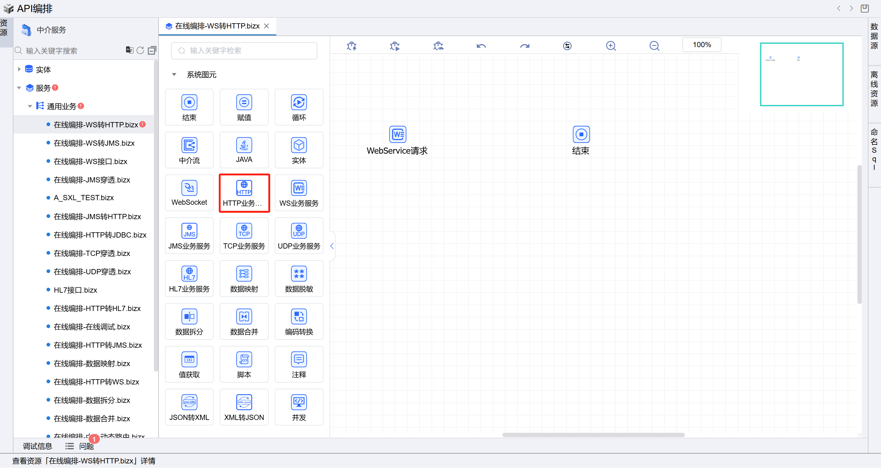 保存成功后,系统自动打开中介编排页面,从左侧拖一个HTTP业务服务图元到开始和结束图元中间,并依次连接各个图元。如下图: