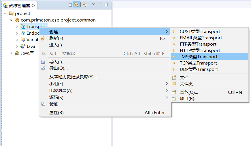 1. 在资源管理器中,右键点击公共Module中"Transport",选择"创建->JMS类型Transport"菜单项,如下图所示: