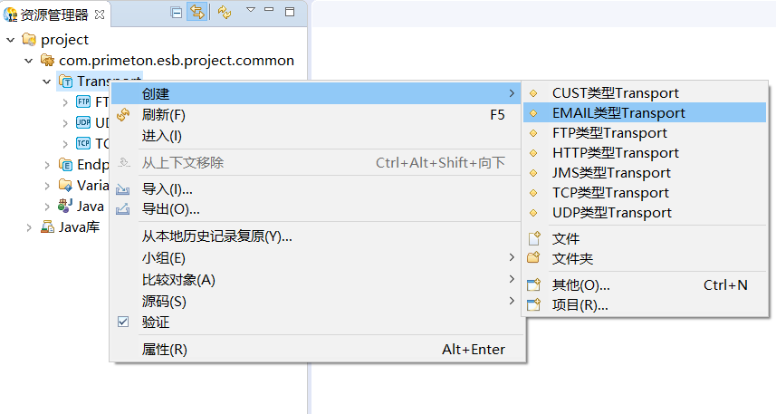 在资源管理器中,右键点击公共Module中"Transport",选择"创建->EMAIL类型Transport"菜单项,如下图所示: