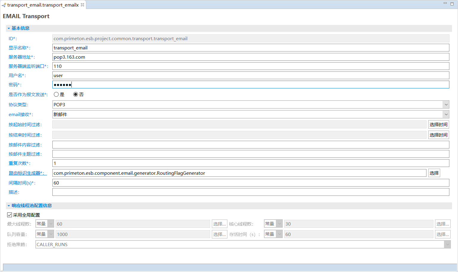 - 文件名:用于存储EMAIL Transport配置的文件名。需要保证在ESB工程中唯一。