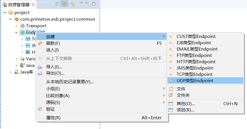 1. 在资源管理器中,选中"UDP"节点,点击右键,选择"创建->UDP类型Endpoint"菜单项,创建UDP Endpoint,如下图所示: