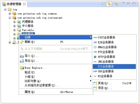 在资源管理器中右键点击业务Module中的"业务服务",选择"创建->TCP业务服务" 菜单项。