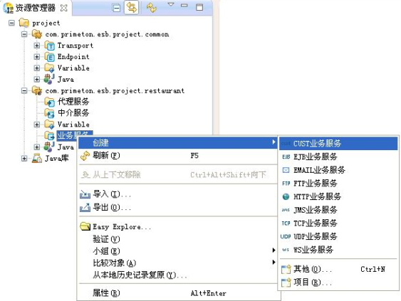 1. 在资源管理器中右键点击业务Module中的"业务服务",由于TUXEDO业务服务首先创建CUST业务服务,首先选择"创建->CUST业务服务" 菜单项。