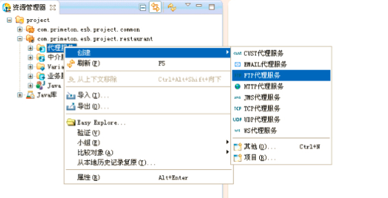在资源管理器中,右键点击业务Module的代理服务项,在弹出的菜单中选择"创建->FTP代理服务",如下图所示: