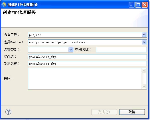 弹出"创建FTP代理服务"窗口,如下图所示,填写类别、文件名等信息后,并点击"完成"按钮,生成FTP代理服务。