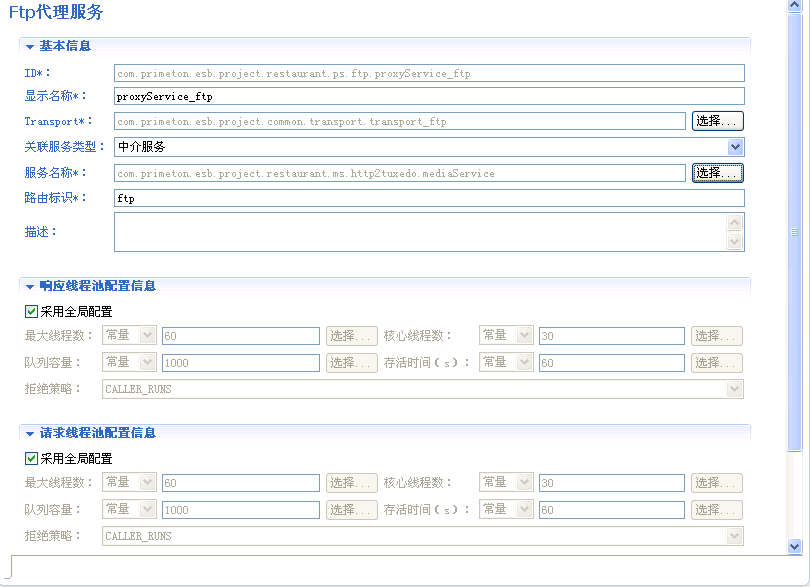 - Transport:FTP代理服务关联的Transport,即FTP代理服务所处理请求的来源。系统运行中,Transport完成请求的接入,然后交予FTP代理服务处理。ESB工程创建时,在公共Module中自动生成缺省的FTPTransport,FTP代理服务选择缺省的FTPTransport即可。