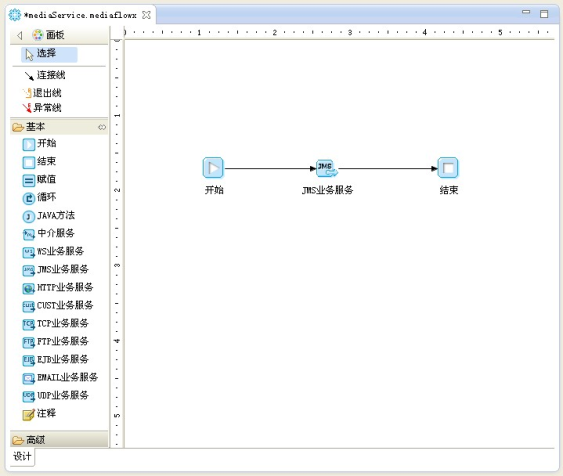 选中JMS业务服务图元将此图元拖拽到编辑区,用连接线依次将开始、JMS业务服务和结束三个图元连接起来,如下图所示: