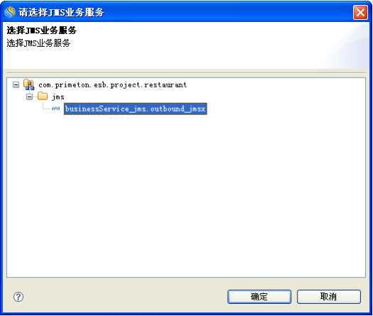 在"设置对话框"窗口中点击业务服务后面的"浏览"按钮,弹出"选择JMS业务服务"窗口,选择对应的JMS业务服务后,点击"确定",如下图所示: