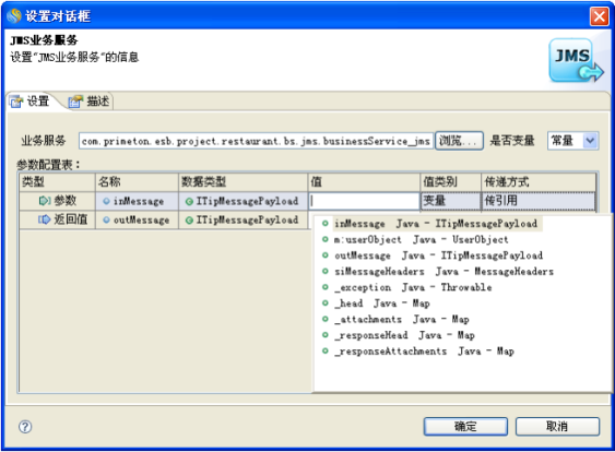 在"设置对话框"窗口中的参数配置表中输入参数和返回值,点击"确定"按钮完成JMS业务服务的参数设置,如下图所示: