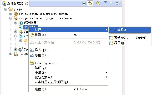 1. 在资源管理器中,选中新建的业务Module的"中介服务"项,点击右键,选择"创建->中介服务"菜单项,创建中介服务,如下图所示。