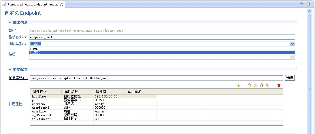 本节中的例子使用Tuxedo自带的"TOUPPER"--即大小写转换(用户输入一串字符,Tuxedo服务端将其转换为全部大写返回);由于服务端是C语言写的,首先按照Tuxedo帮助文档中的步骤,配置服务器、设置正确的IP和端口,编译服务端代码,并启动Tuxedo服务器,ESB采用的是JOLT方式与Tuxedo进行交互。 本示例中通过浏览器模拟调用者,用HTTP请求到达ESB后会转化成为TUXEDO协议所对应的请求服务;由于TUXEDO并不是一个独立的协议,而是属于自定义CUST协议的一种,所以要使用TUXEDO服务,首先创建CUST,在配置中选择TUXEDO。