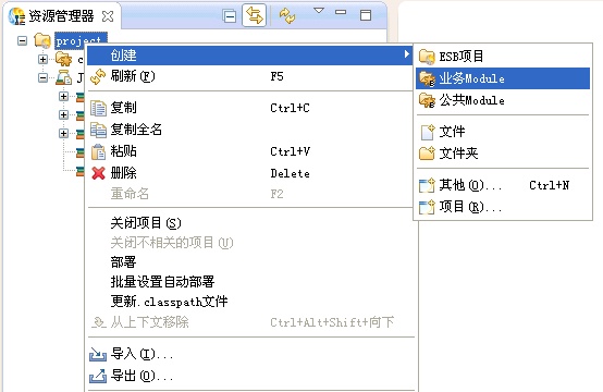 在资源管理器中,选中project,点击右键,选择"创建->业务Module"菜单项,创建业务Module,如下图所示。