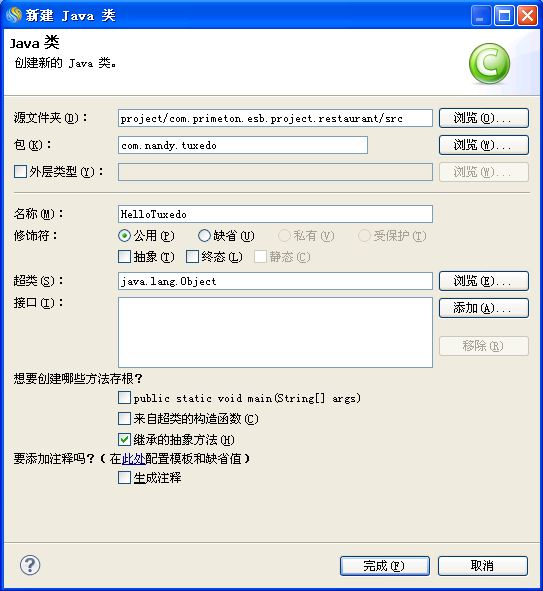 2.在弹出的"新建Java类"向导中输入相应信息后,点击"完成"按钮即可,如下图所示。