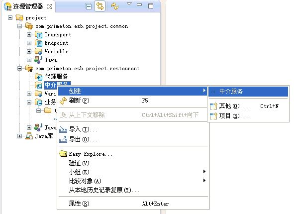 打开ESB Studio,在资源管理器中,点击右键,选择"创建->ESB项目"菜单项,创建工程,如下图所示。