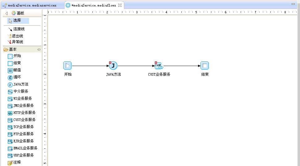 4.在"中介服务"编辑页面点击"服务编排"链接,进入编排中介服务的界面。在"选用板"中将"JAVA方法"和"CUST业务服务"图元拖拽到右边的编辑区,并用"连接线"依次连接,如下图所示。