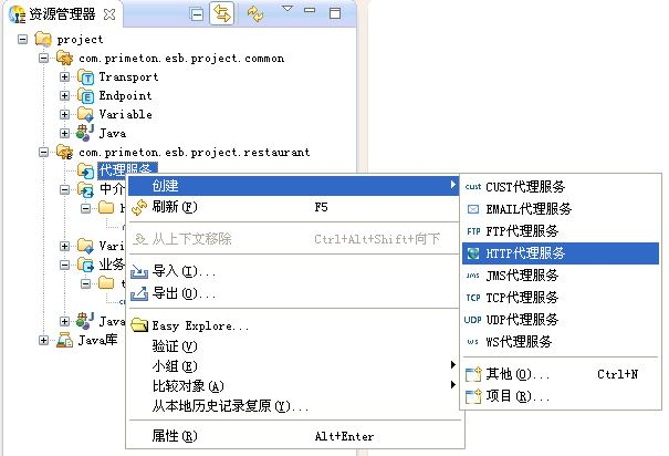 在资源管理器中,选中新建的业务Module的代理服务项,点击右键,选择"创建->HTTP代理服务"菜单项,创建HTTP代理服务,如下图所示。