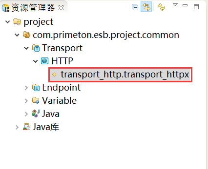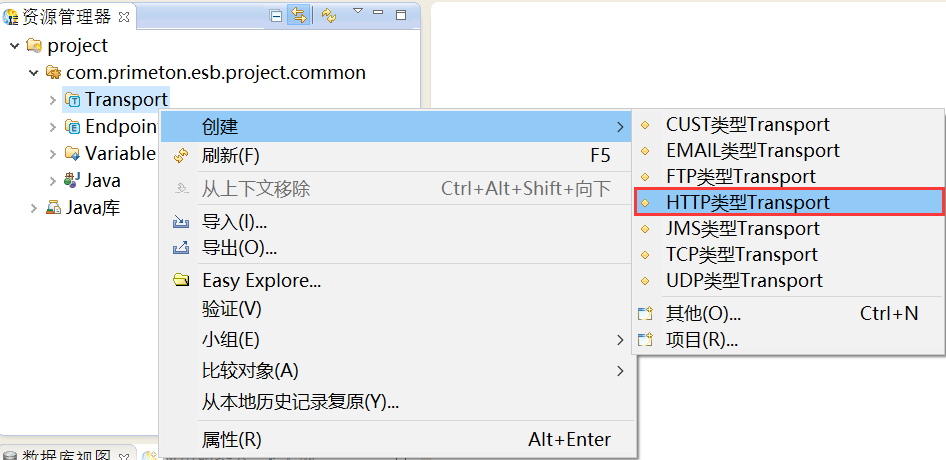 在创建的ESB项目的“Transport”上,右键选择“创建 > HTTP类型Transport”,如下图所示。
