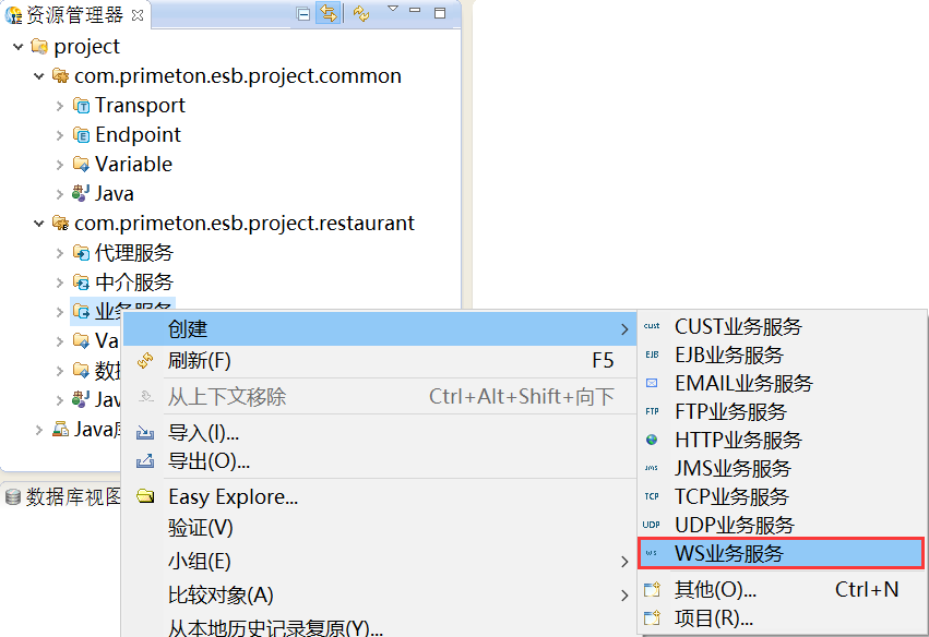 在资源管理器中,在新建的业务Module“com.primeton.esb.project.restaurant”的“业务服务”上,鼠标右键选择“创建 > WS业务服务”,创建WS业务服务,如下图所示。